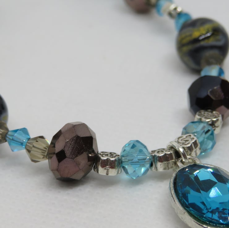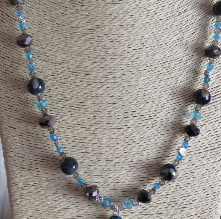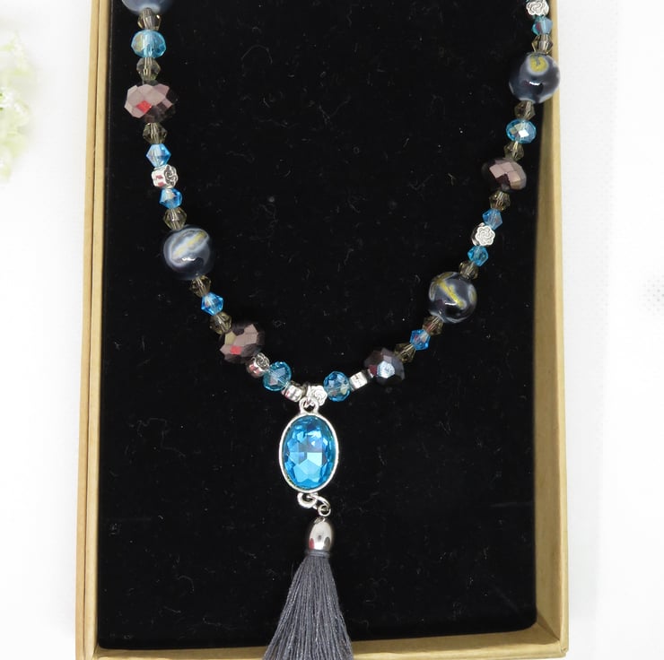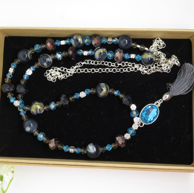A sparkly aqua glass connector and grey tassel with stainless steel cap form the focal points for this long necklace. The beaded necklace is composed of turquoise and grey bicones, grey glass beads with a gold swirl, large grey/bronze crystals and turquoise crystal rondelles, with tibetan silver spacers. It is firmly beaded onto strong tigertail wire and the ends of the necklace are connected by a length of silver plated chain. This is a lovely long necklace that you can just slip over your head, so is really easy to wear and very versatile.
