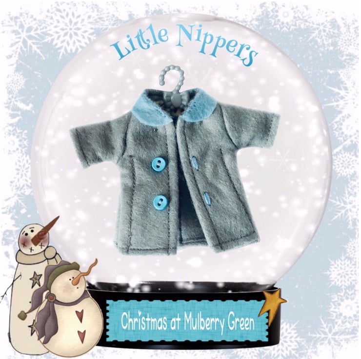 A sweet tailored felt coat to fit the Little Nippers. The coat is made from best quality wool felt in light grey with a pale blue collar. It has cute little blue buttons, stitched detail on the front and comes on a little hanger.
