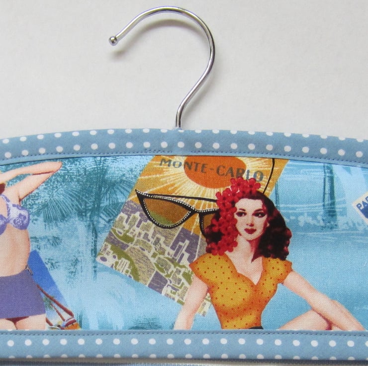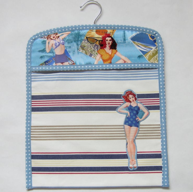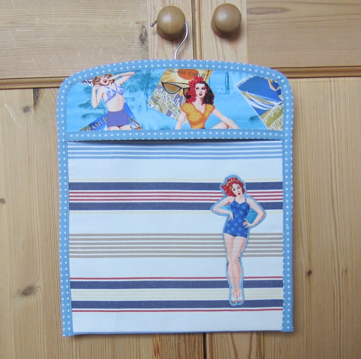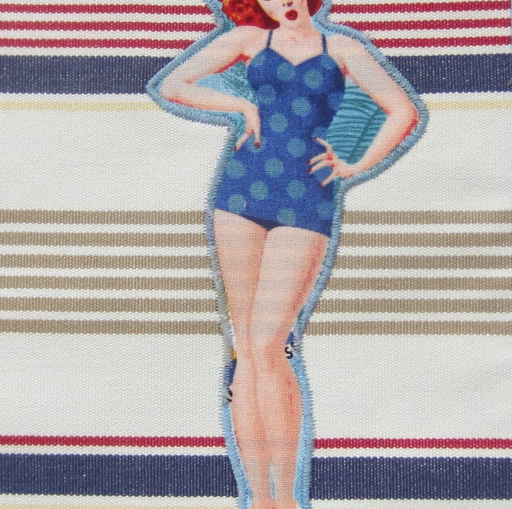 This sturdy and fun peg bag is made with cream, navy blue, red and light brown striped fabric with an appliqued vintage looking lady in swimsuit and matching top panel.