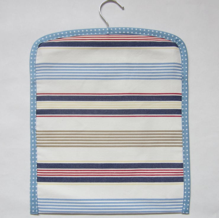 It is fully lined with a coordinating blue/grey fabric and is edged in blue and white spotty bias binding.