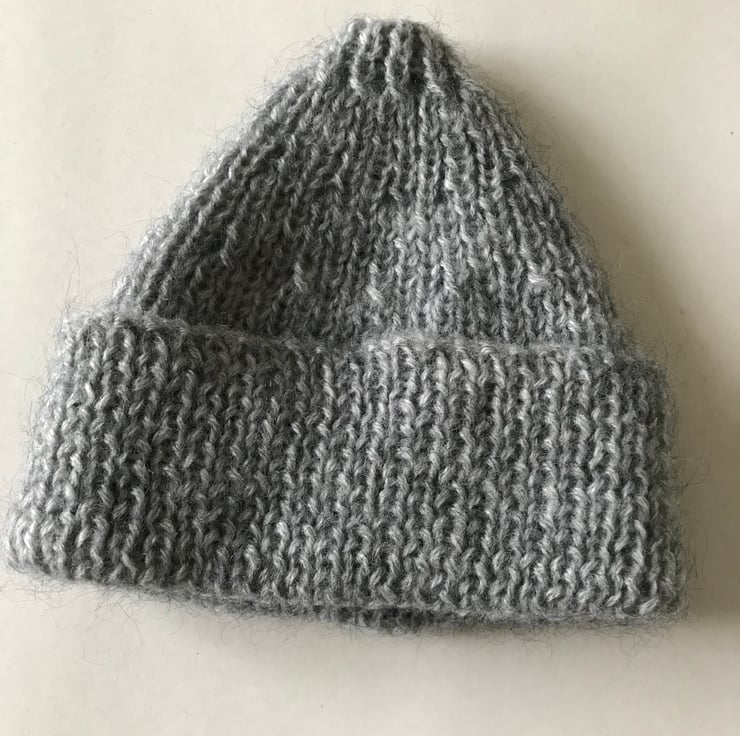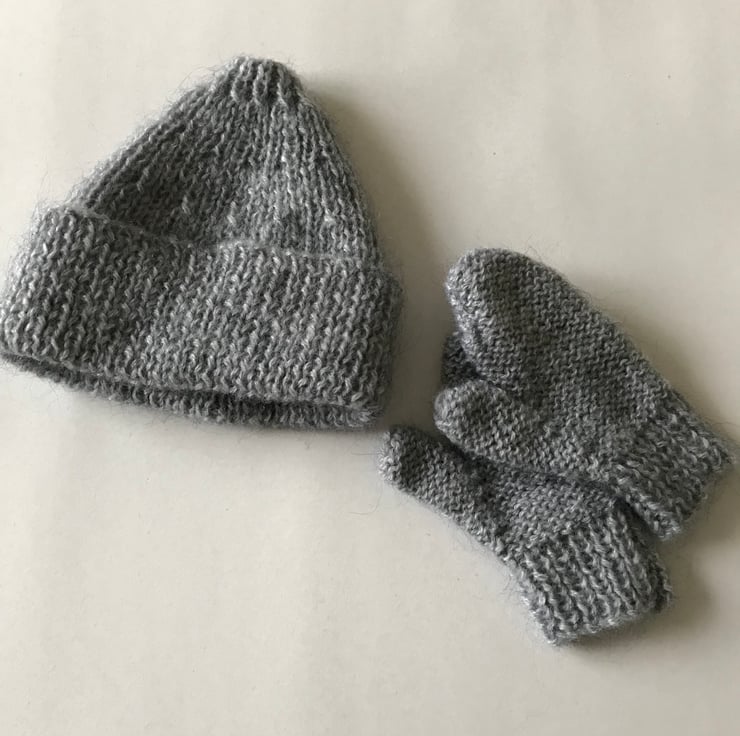 A handmade young child's hat and mittens knit from a vintage pattern in a vintage yarn. The yarn is used double making it chunky and as it contains mohair has a slightly fluffy look. The hat has a deep folded brim and is knit in a rib stitch and the mittens have thumbs.