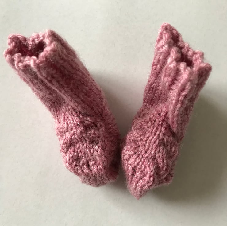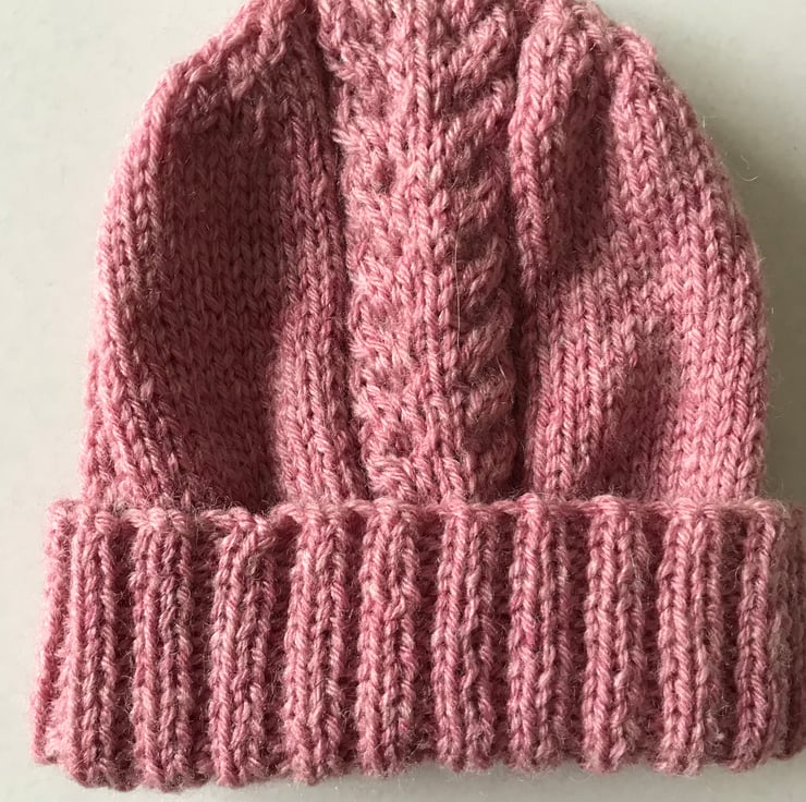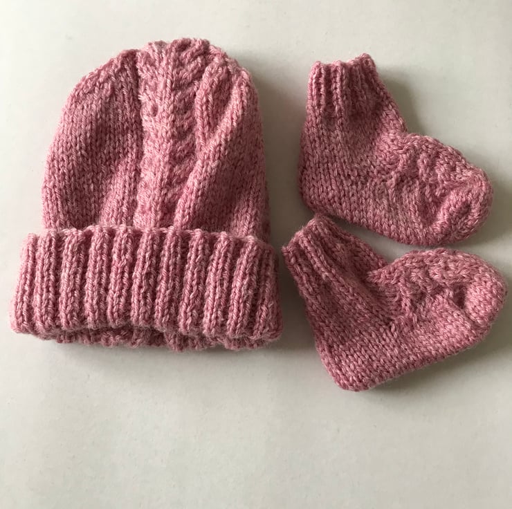 This handmade set of hat and bootees is knitted from a wool mix 4ply yarn. They have a cable pattern on them and the hat has a folded back brim.