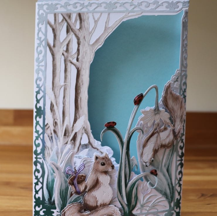 The front of this card has a gift giving squirrel set in a beautiful woodland scene, that is full of colour and decoupage.