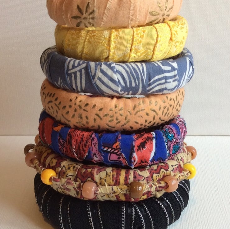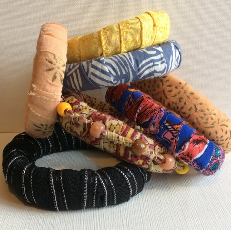 This one of a kind, slip on bangle has been constructed with recycled plastic banding, wrapped and padded with fleece wadding then covered with fabric. The fabric is a light weight cotton, peach with a gold embossed pattern. The bangle is light, flexible and easy to wear. It would enhance any outfit.