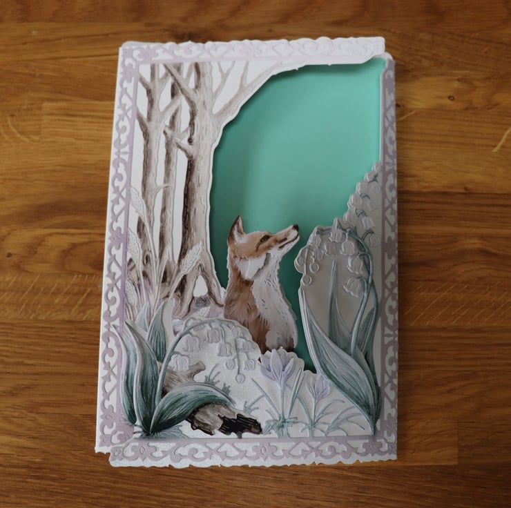This card has a woodland scene that is full of decoupage, and in the center of the scene is Mr fox, he to is made up of decoupage.