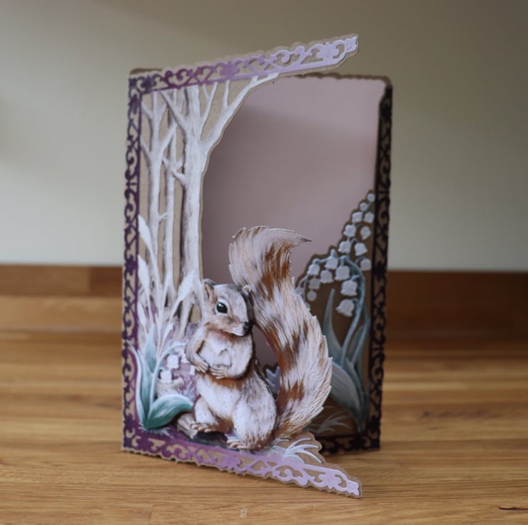 This card base is Kraft card (best quality) with a woodland scene full of decoupage flowers and going for a walk in the middle of the woods is Mr Squirrel with his big bushy tail.