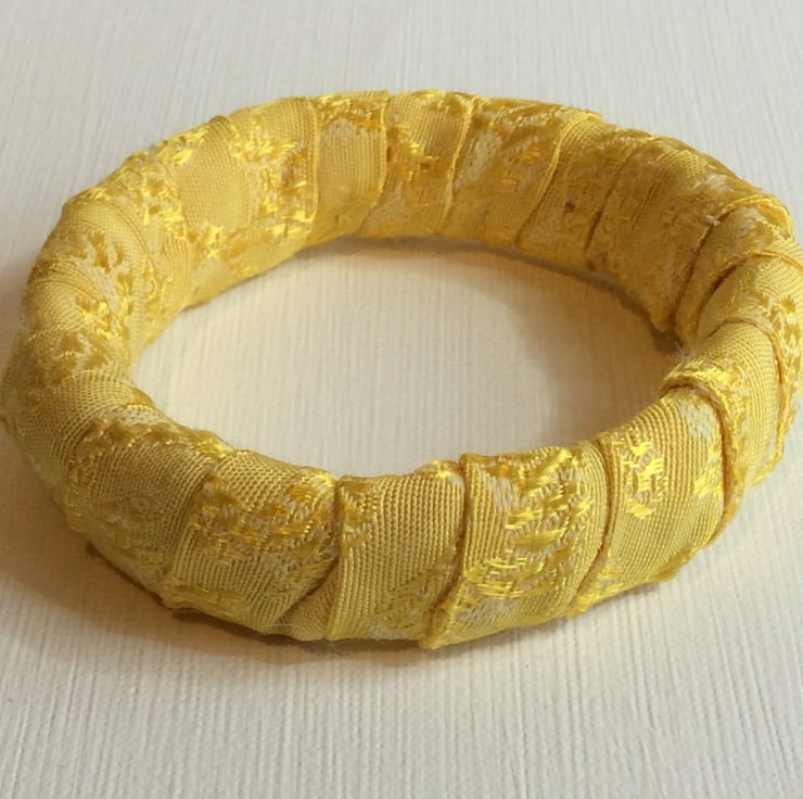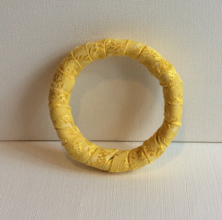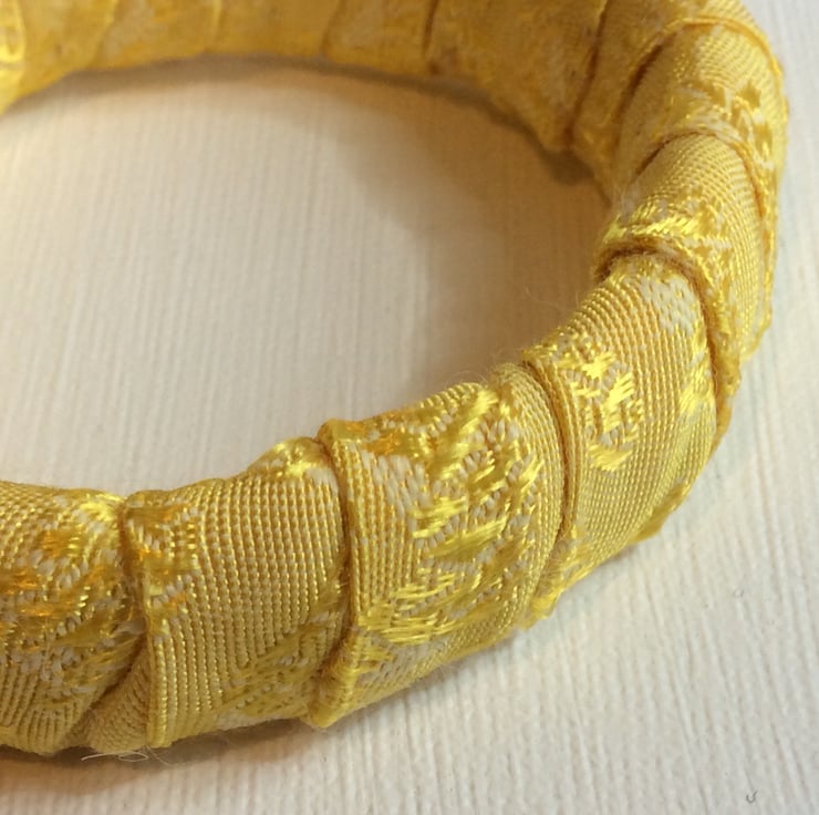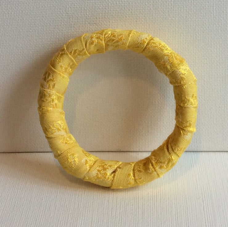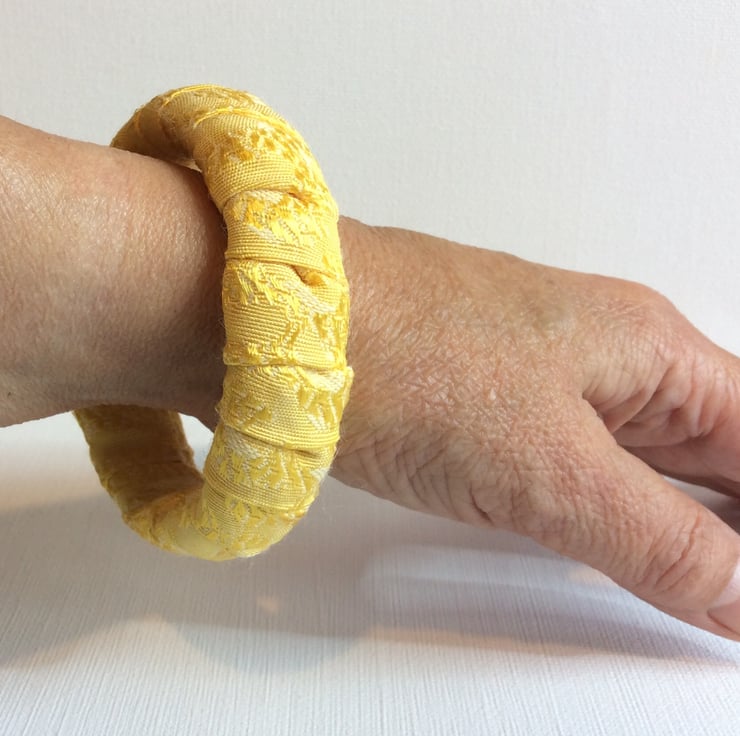 This one of a kind, slip on bangle has been constructed with recycled plastic banding, wrapped and padded with fleece wadding then wrapped with fabric. The fabric is a shimmering two tone gold. The bangle is light, flexible and easy to wear. It would enhance any outfit.