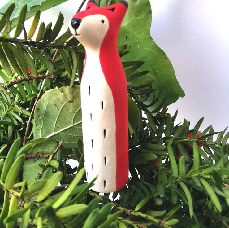 The fox ornament is hand sculpted from a stoneware clay, glazed with underglaze colours and fired to 1160 degrees centigrade.