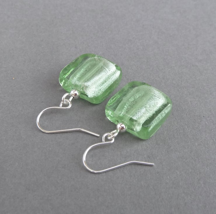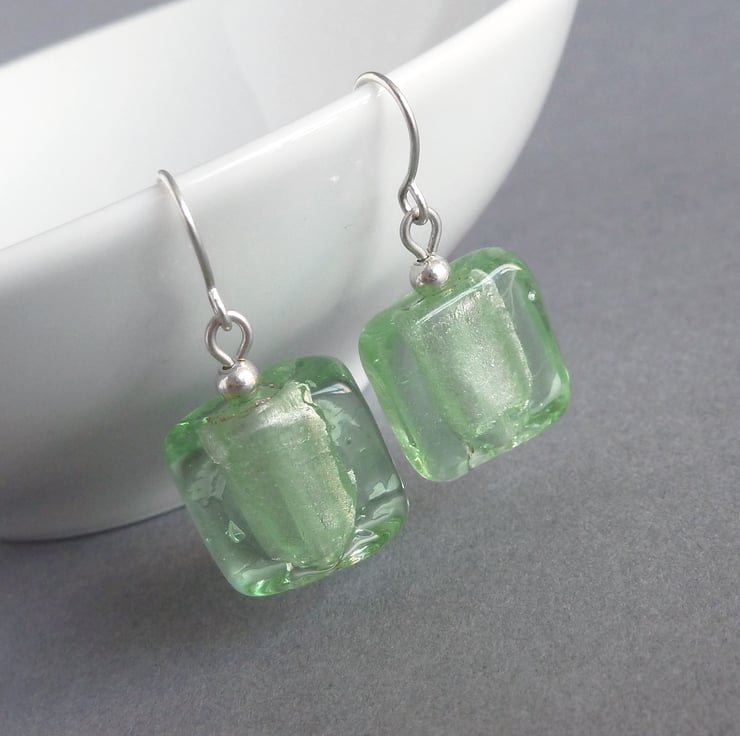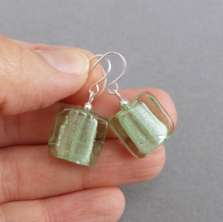 Each pale green square bead measures 1.5cm wide. Each square glass earring drop dangles 2cm from the bottom of the silver plated ear hook. I will include a pair of plastic stoppers to make sure your earrings stay securely in place.