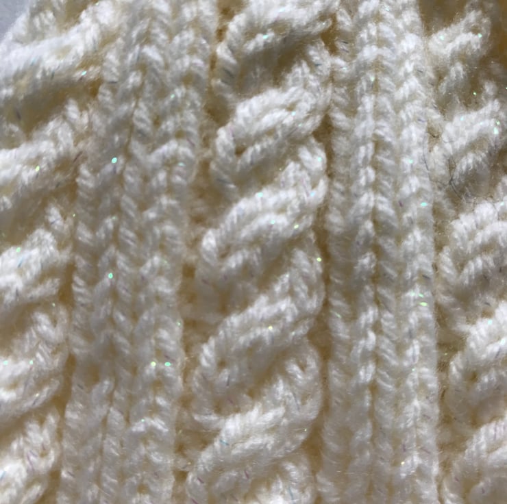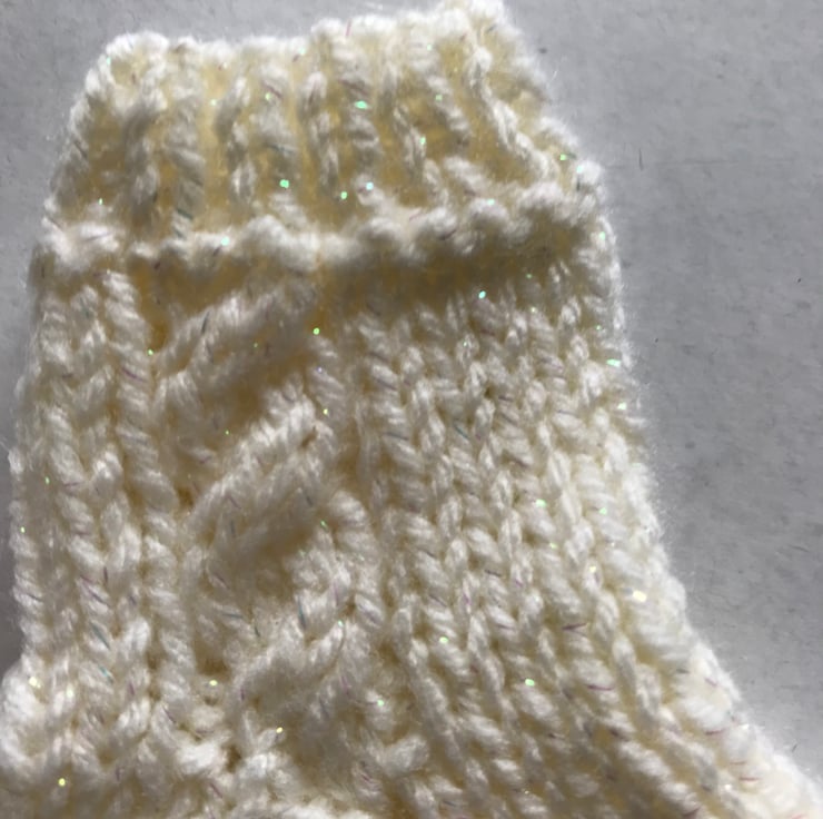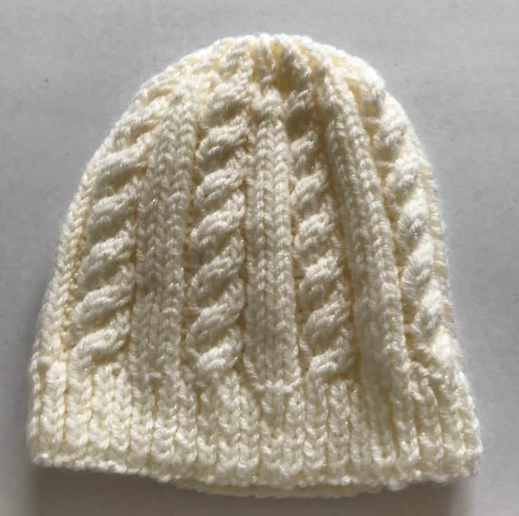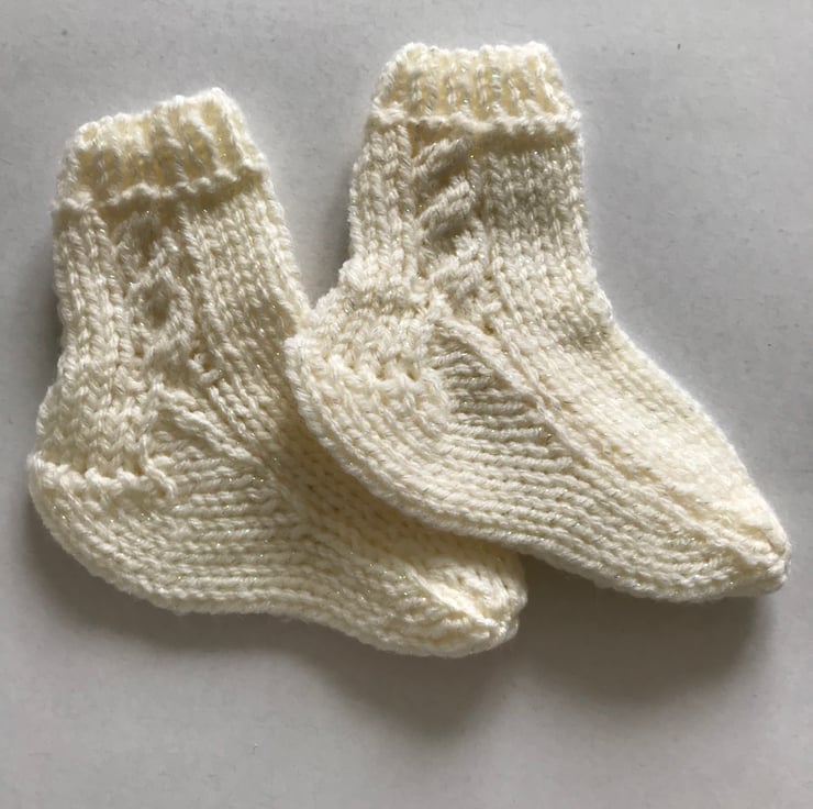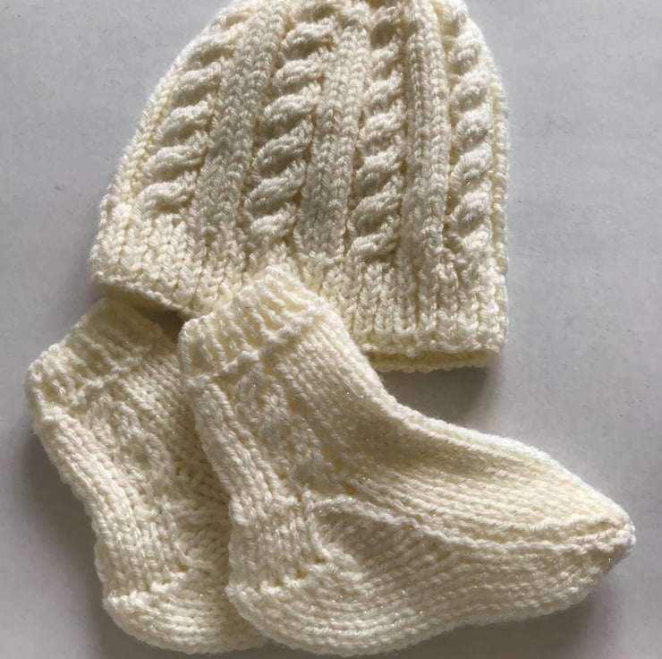 A lovely sparkly hat and sock set knit in a soft cream baby yarn. The hat has cables all round it and the socks have cables up the sides. The set would make an ideal gift for a baby to wear during the winter season.