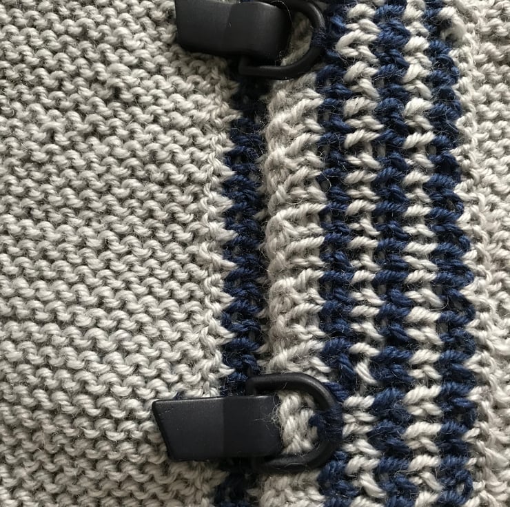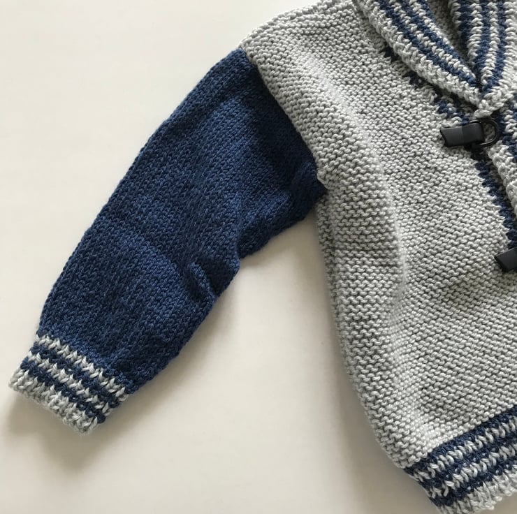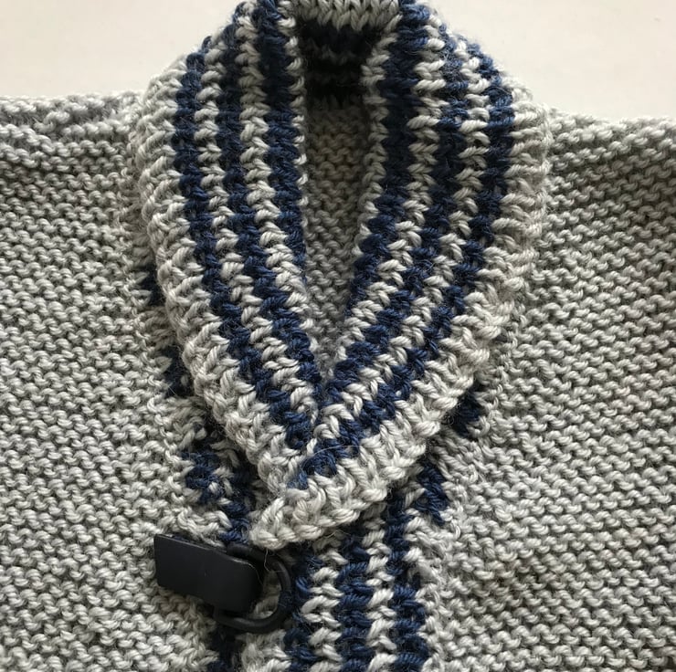 This is a classy, smart jacket in grey and blue. It is knitted in a soft wool mix yarn. The jacket has a shawl collar and unusual clip fastenings at the front. It has stripes round the bottom, cuffs, collar and front bands.