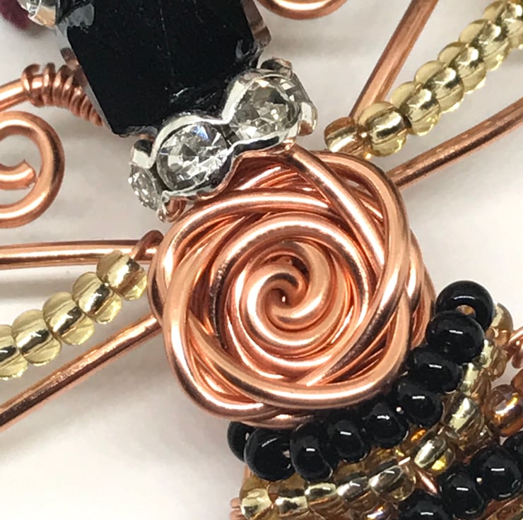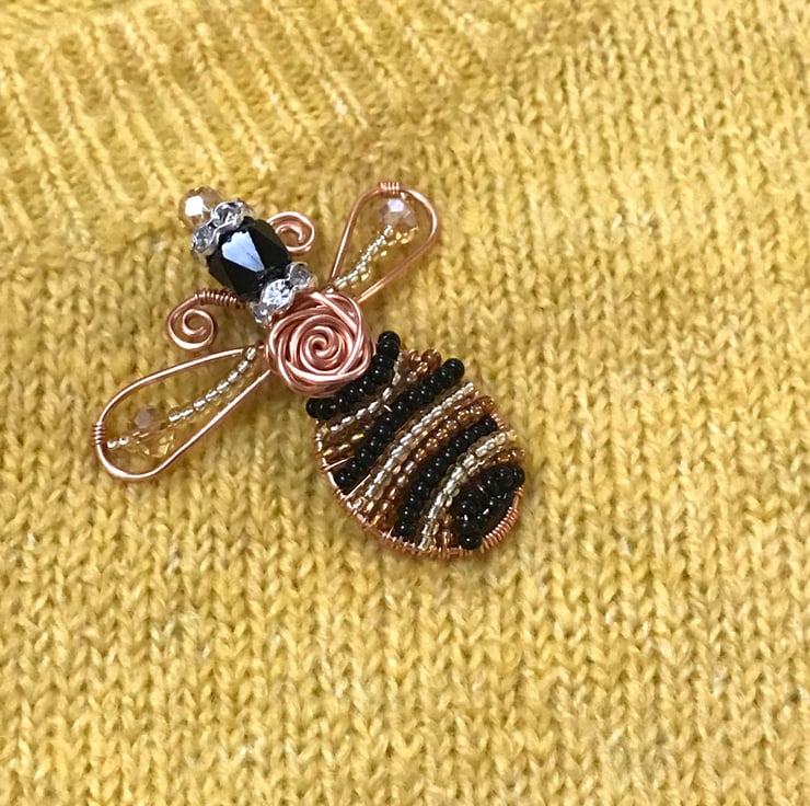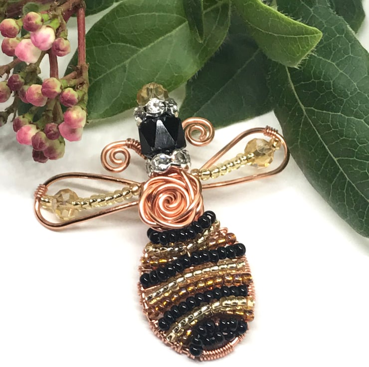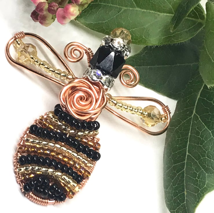 I have shaped copper wire into a Bee and gently hammered to strengthen and created a rose feature in the centre of the bee. Seed beads in black, pale gold and bronze are threaded and weaved with copper wire in and around the body and a black bead, rhinestone spacers and crystal beads for the head of the bee. A copper brooch back is attached at the back.