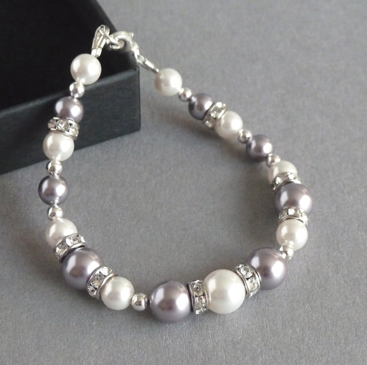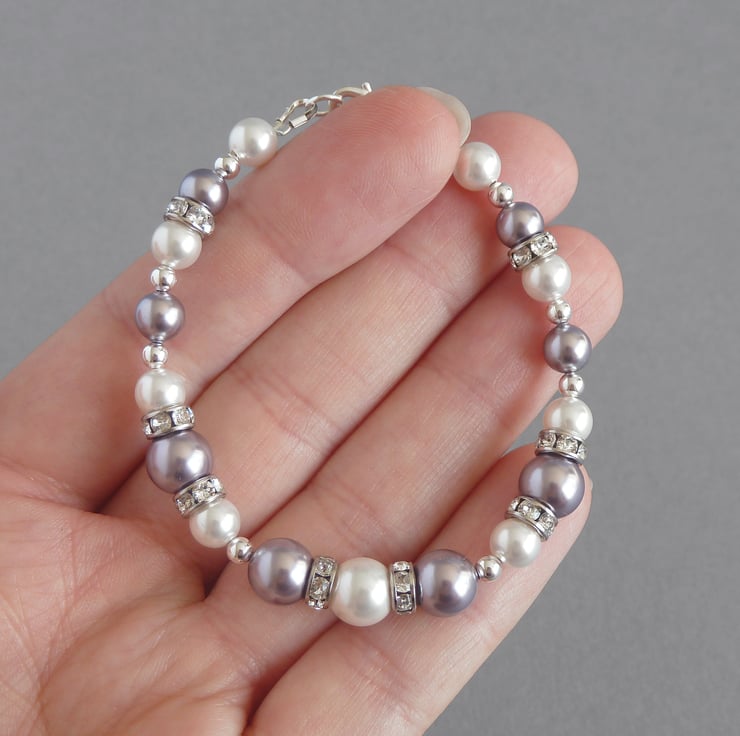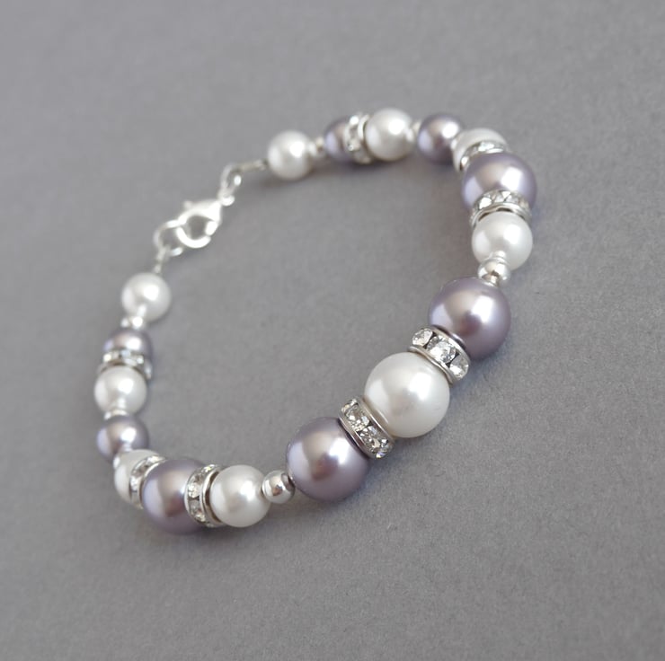 Lavender and white pearls have been teamed with bands of sparkling Swarovski crystals to make this lilac pearl and crystal bracelet. Created using mauve and white Swarovski pearls, round silver beads and Swarovski crystal rondelles, this light purple single strand bracelet would make a beautiful gift and would be perfect to wear for a wedding or special occasion.