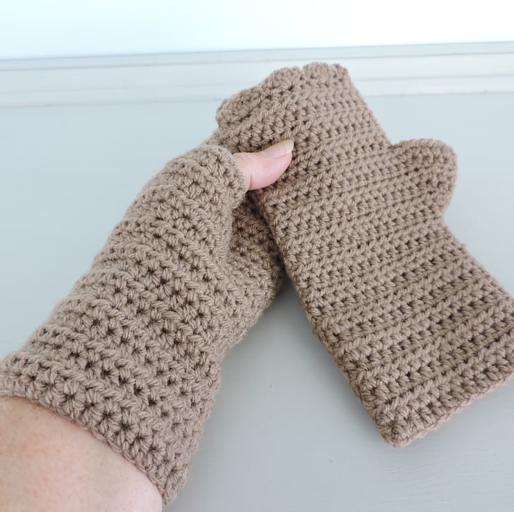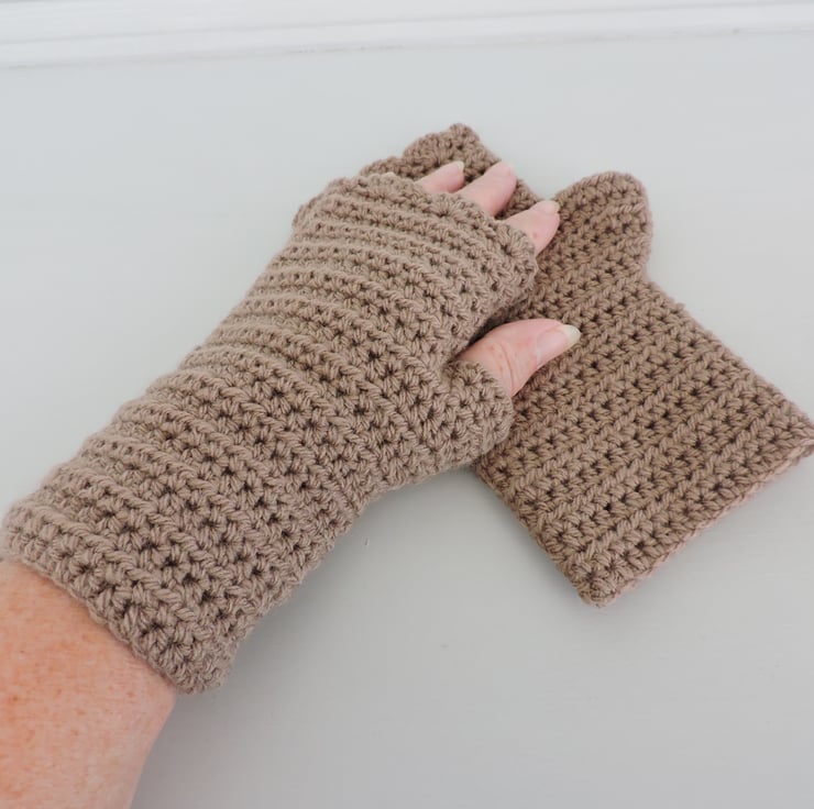 These simple crocheted fingerless mitts, wrist warmers, gloves have been made using a soft premium caramel double knit acrylic yarn. They have a plain body with a wavy edge top.