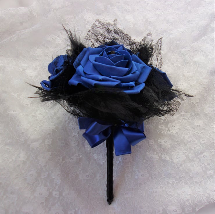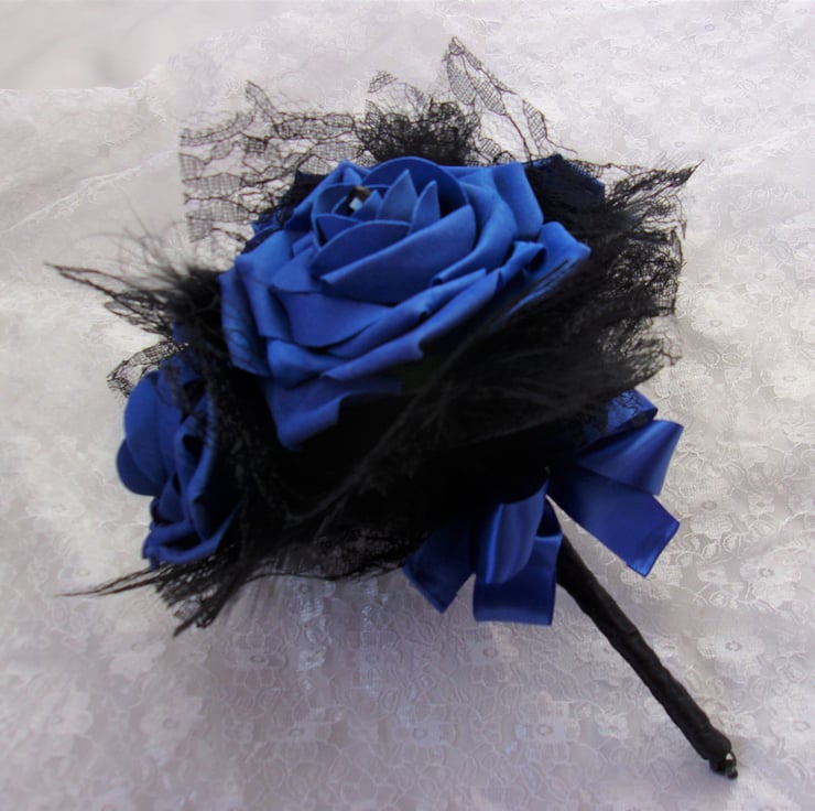 Created with five large open cobalt blue artificial foam tea roses, studded with black rondelle glass crystals in the centre of each and wrapped with stiffened black lace pieces.