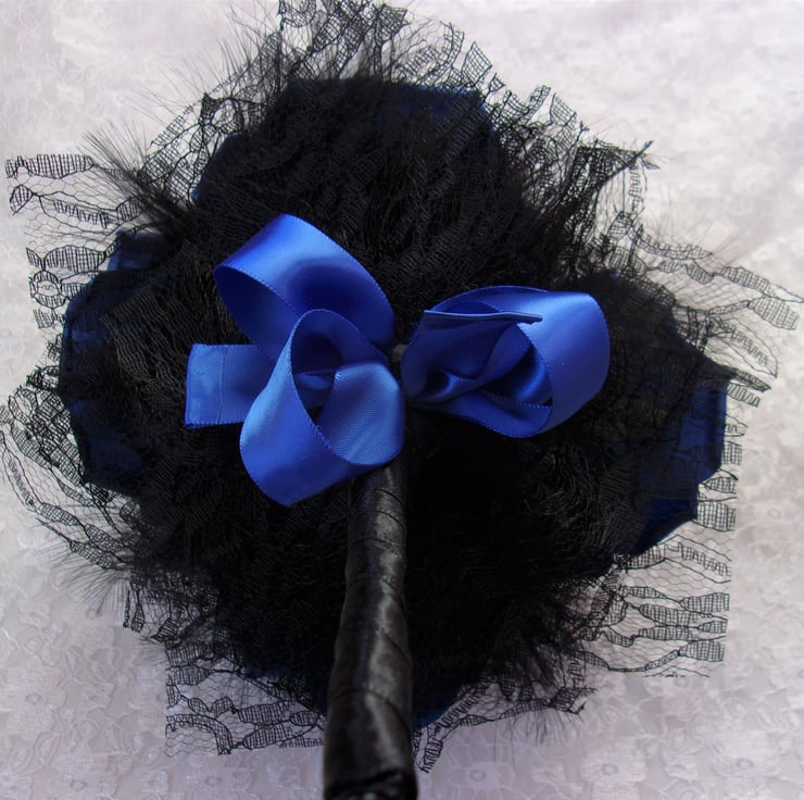 Finished with a royal blue satin ribbon bow, with crystal pins in the top and end of the handle and completed with a black satin ribbon bound handle.