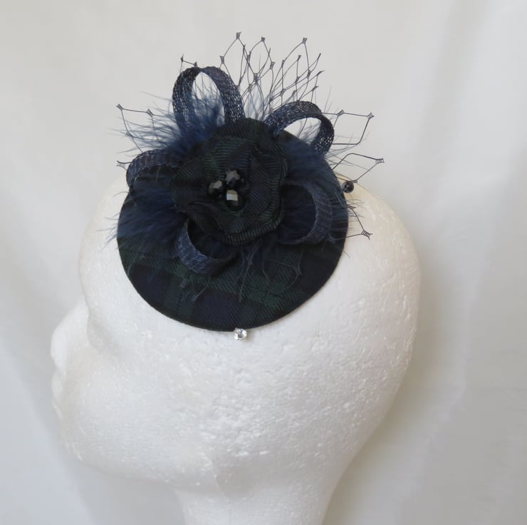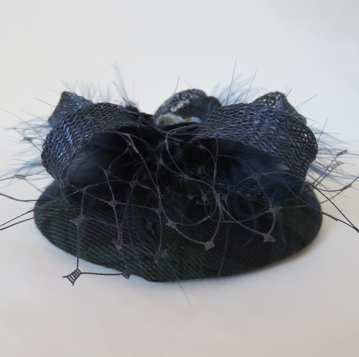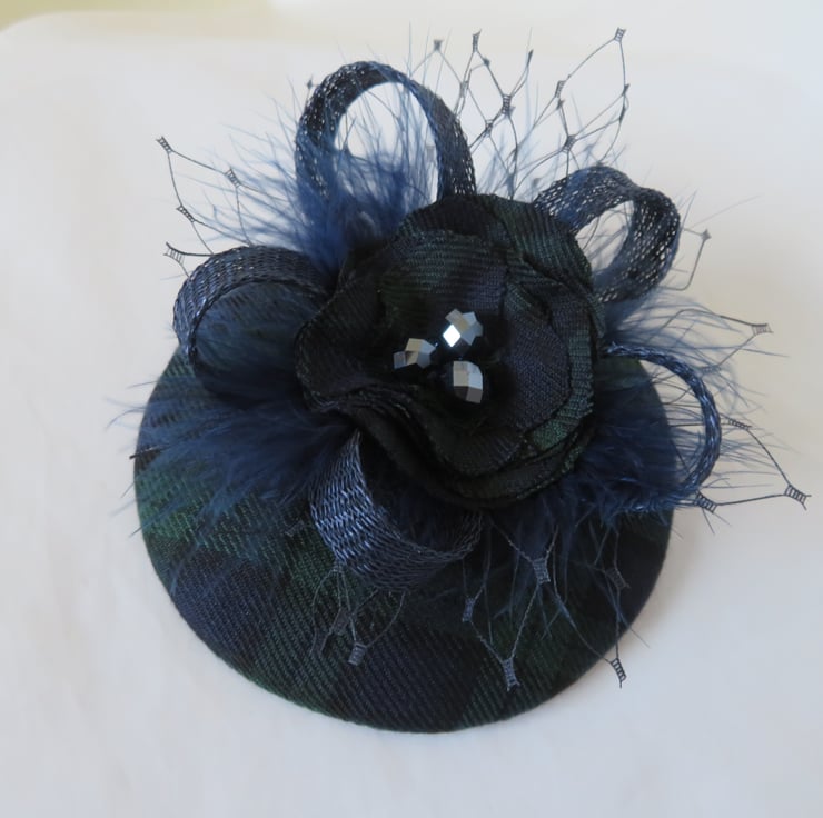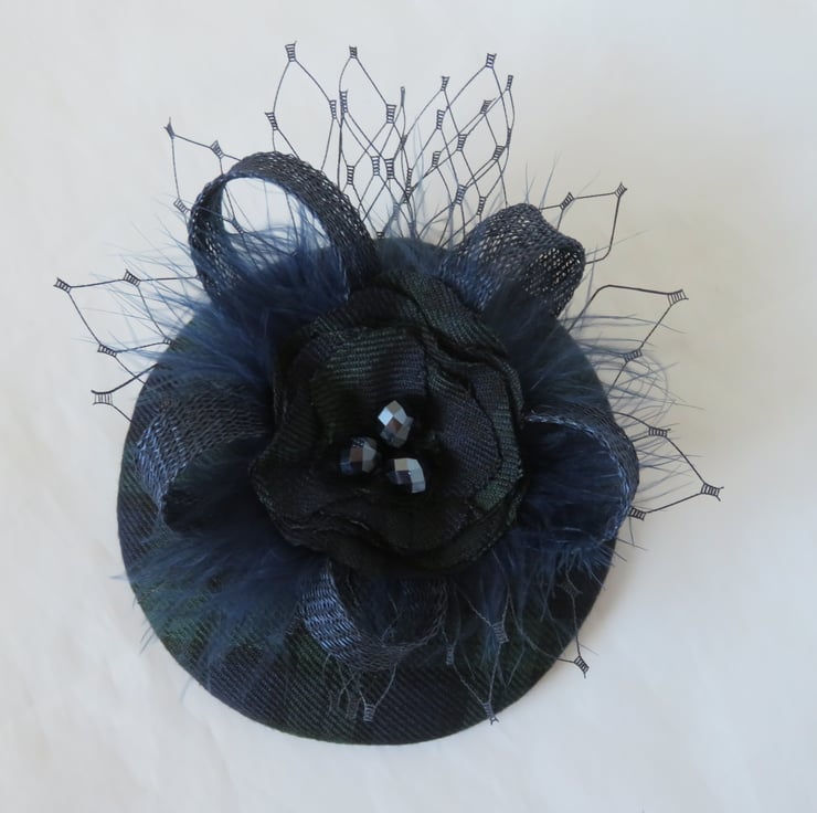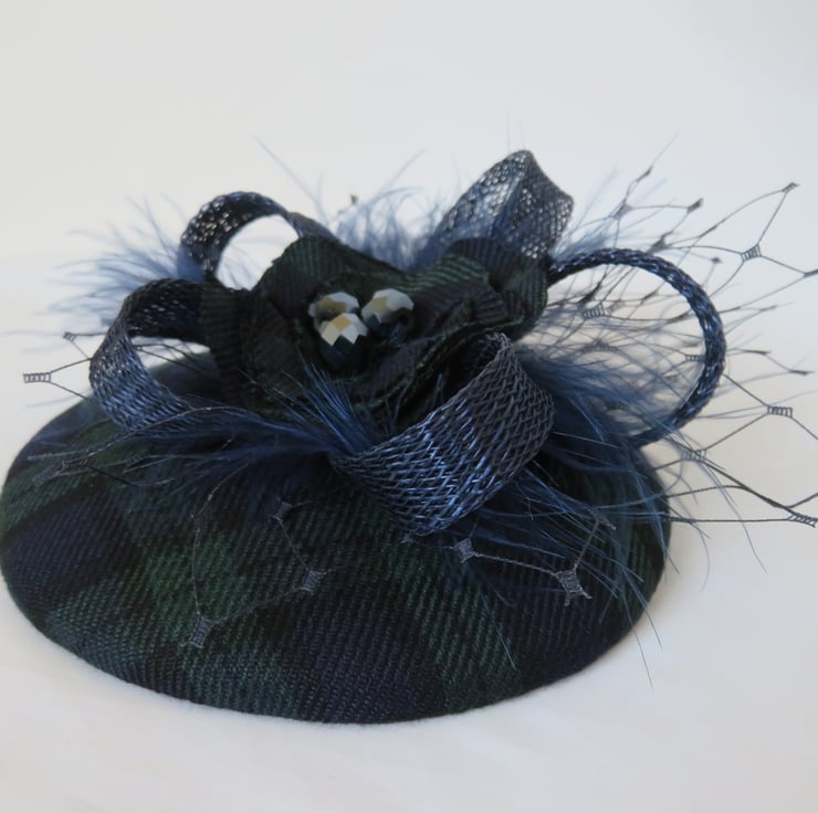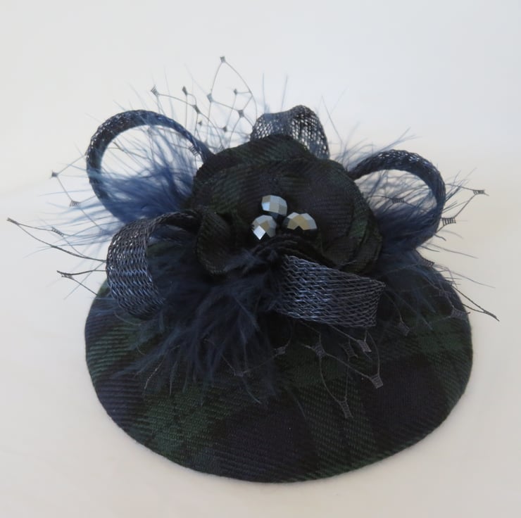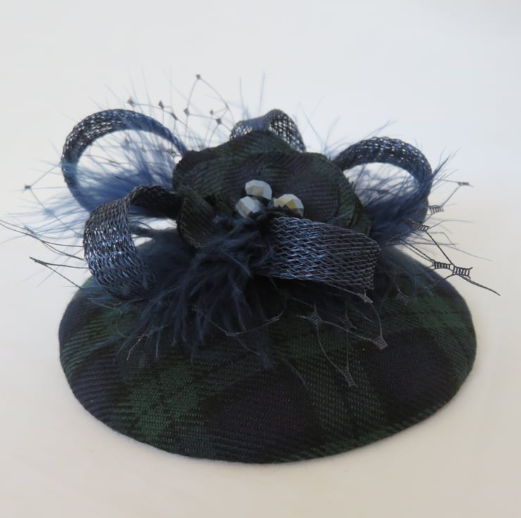 Complemented with a black or navy sinamay loops, navy blue merry widow veiling,navy marabou fluff feathers and a small flower made from the tartan fabric with three large navy glass rondelle crystals.