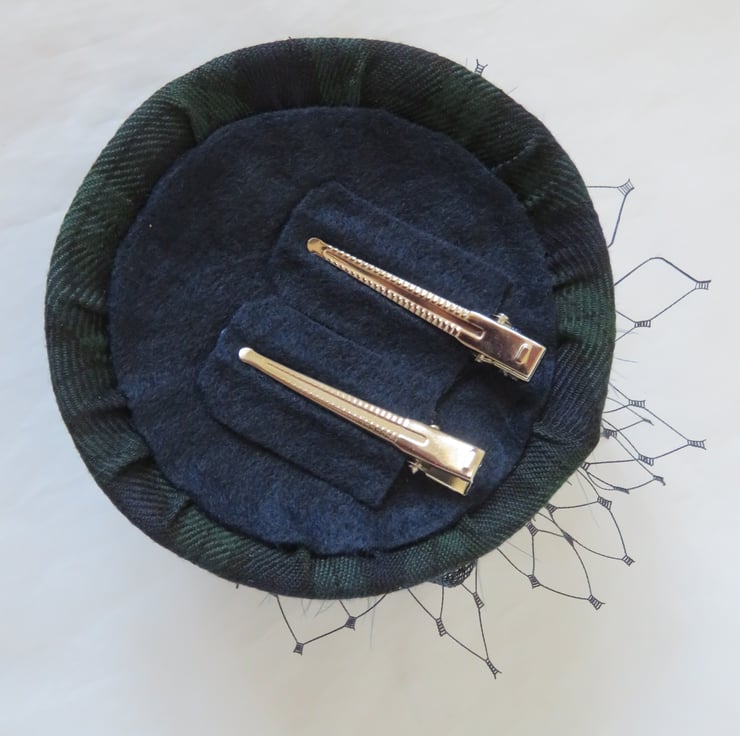 Created with a round sinamay base which is covered with a cotton mix Black Watch tartan fabric with a circle of felt underneath with a two metal croc clips for fixing.