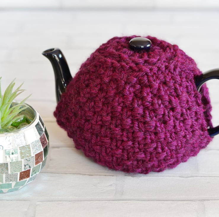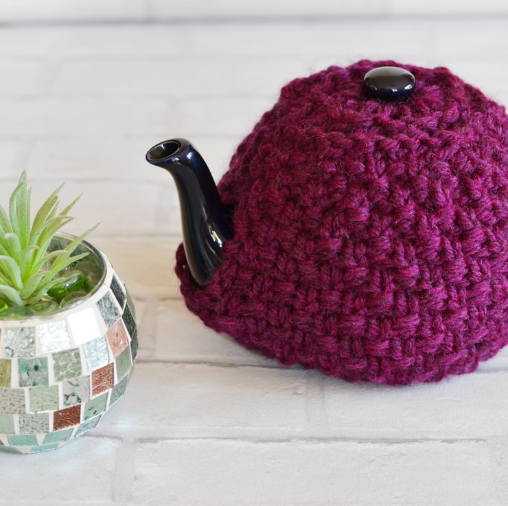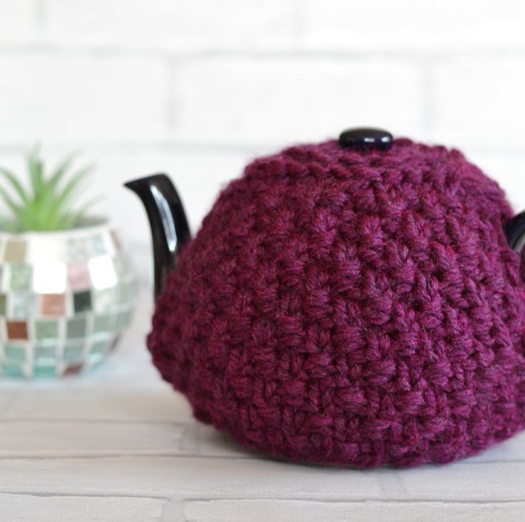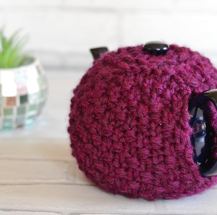 New design for this winter a super chunky knit tea cosie which is one of my own patterns. Choose your colour from the dropdown menu. It has a small hole on top for the lid to fit through. Please allow 1 week to be made before posting.
