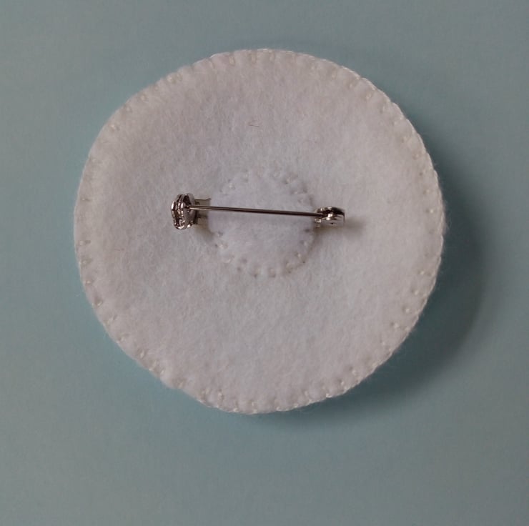 The circular white felt background has been neatly hand stitched together around the edge with blanket stitch. A small piece of stabilizer inside gives the brooch some rigidity.