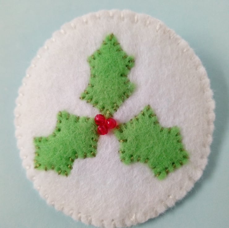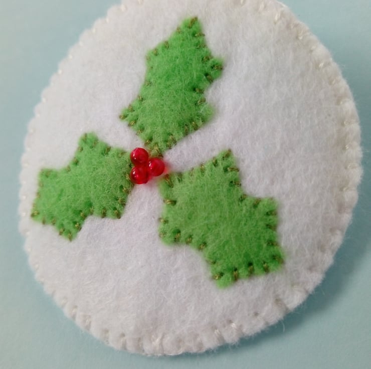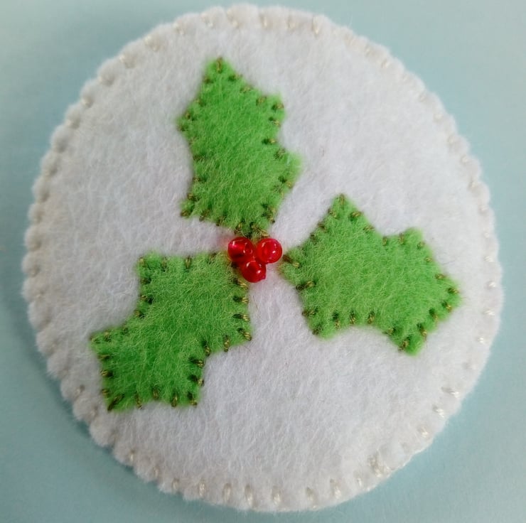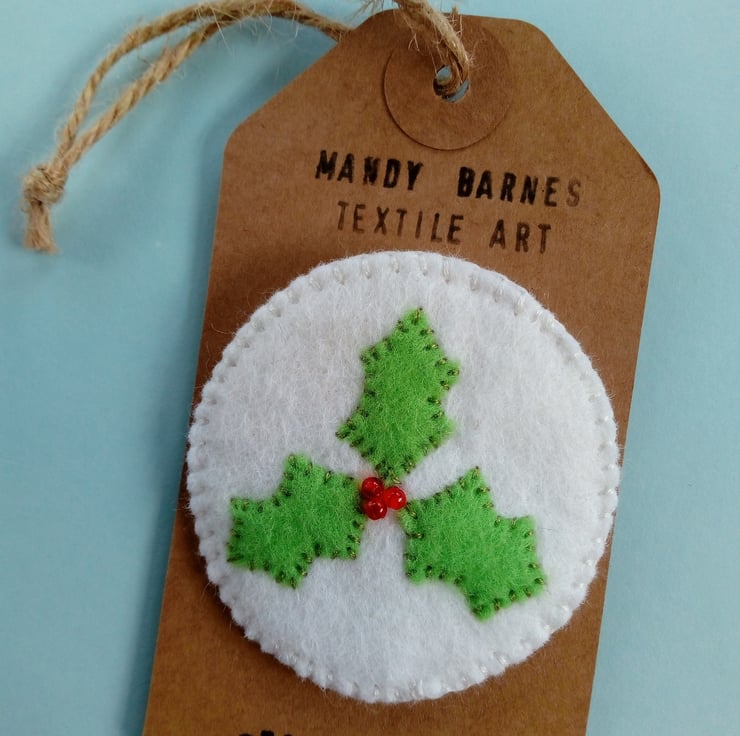 This lovely festive brooch designed and handmade by myself, features a seasonal sprig of holly.