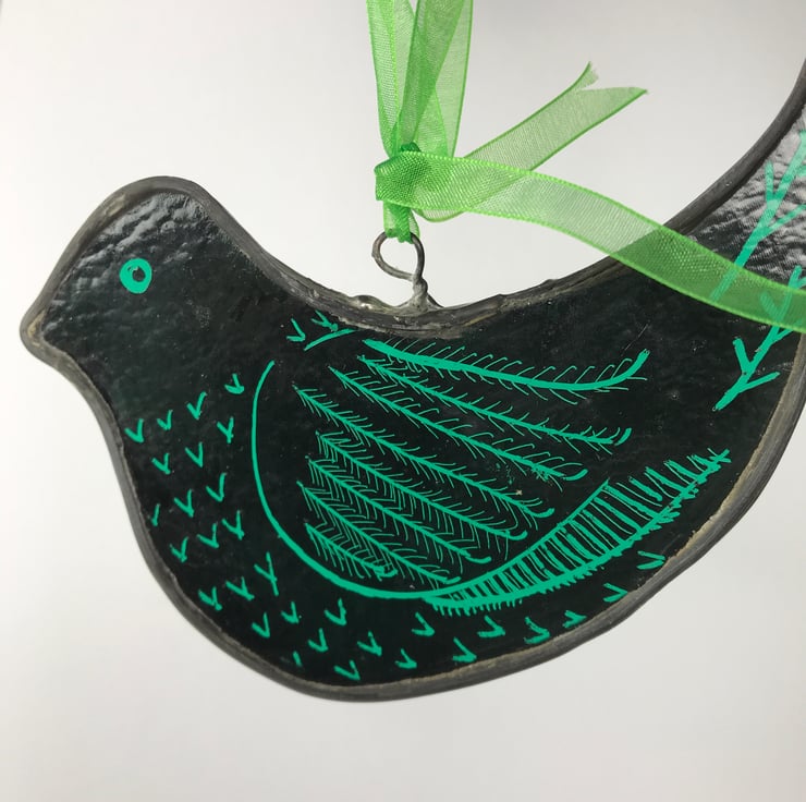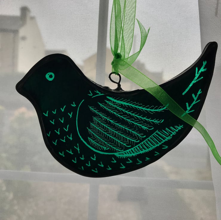 I hand cut the bird shape, use a pestle and mortar to grind the stained glass paint and apply to the glass. Once I am happy with the design it is then placed in the kiln to seal the paint. I then cut lead to fit, solder it cement it, leave it overnight to harden then remove the residue before soldering on a hook. It’s a lengthy process but very satisfying.