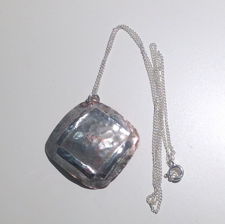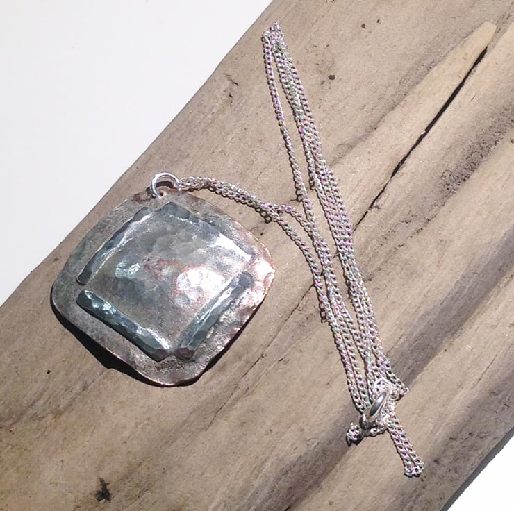 This rustic pendant necklace is hand forged from copper with a hammered and domed design. The pendant has sterling silver embellishment and an attractive partial silver plated coating which creates an organic, abstract style effect.