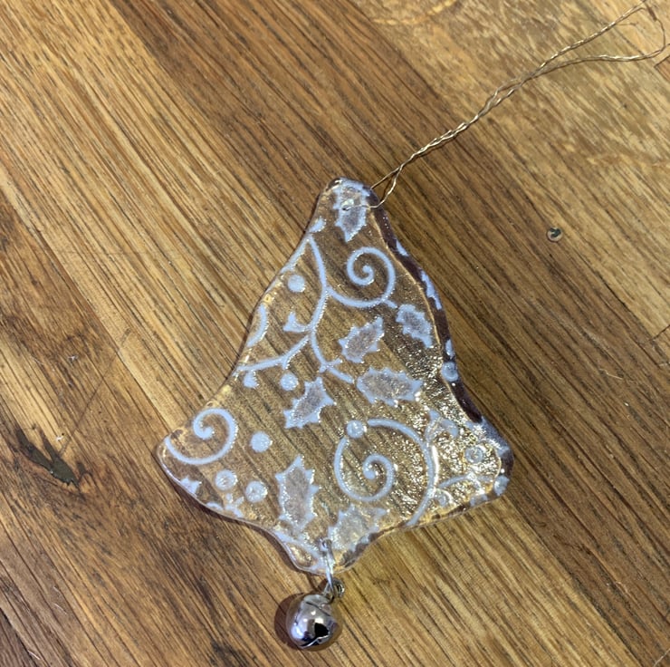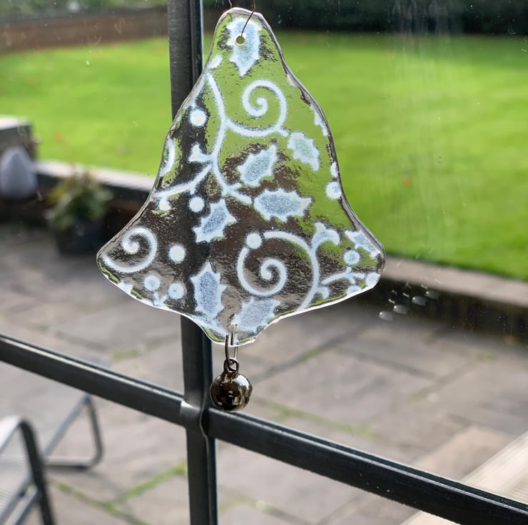A beautiful handmade fused glass embossed christmas decoration in the shape of a bell with small bell attachment.