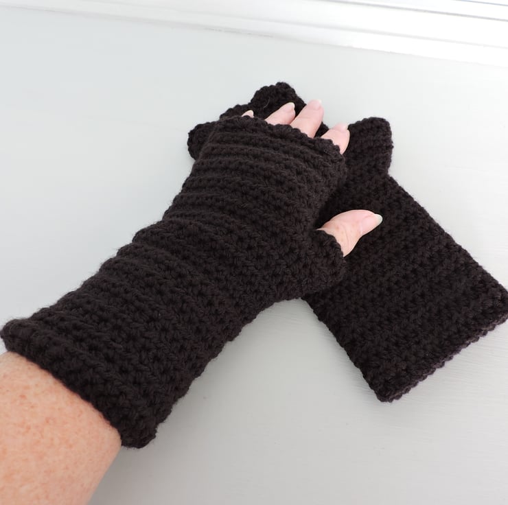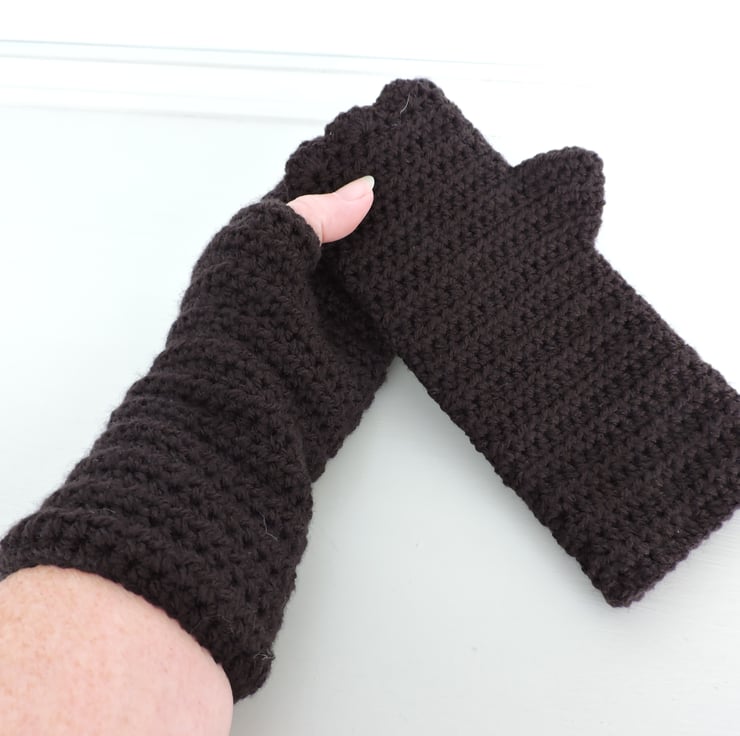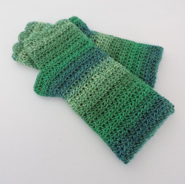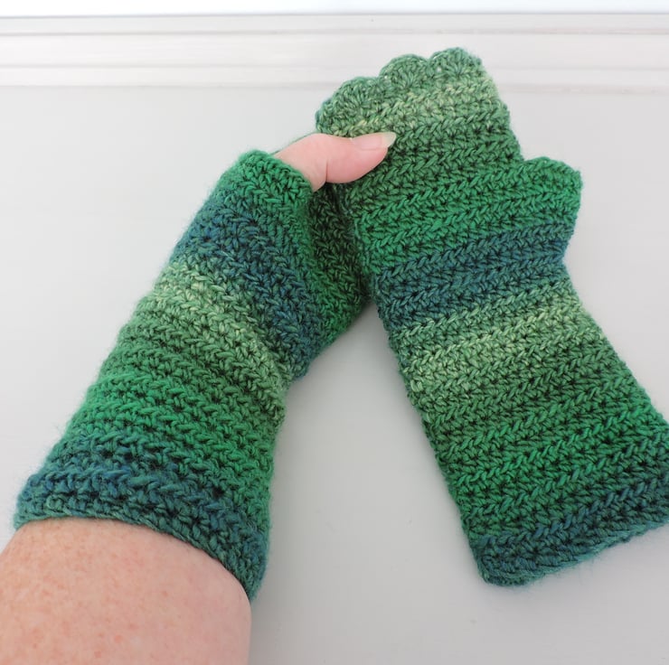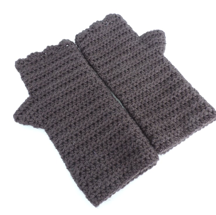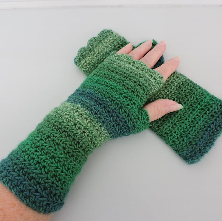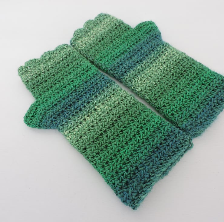 2 pairs of fingerless mitts for Sam. Crocheted in 100% acrylic yarns, they have a simple plain body with a wavy edge tops .