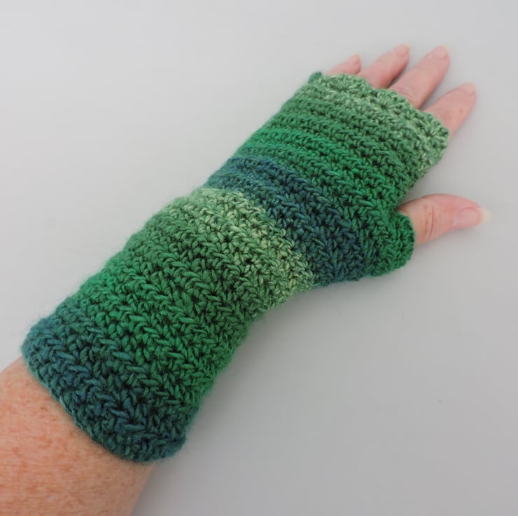 2 pairs of fingerless mitts for Sam. Crocheted in 100% acrylic yarns, they have a simple plain body with a wavy edge tops .