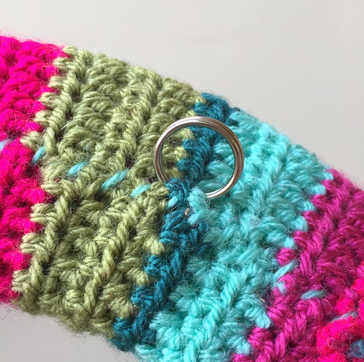 Crocheted in stripes of acrylic yarn in bright Christmas colours - green, teal, turquoise, fuchsia purple and bright pink.