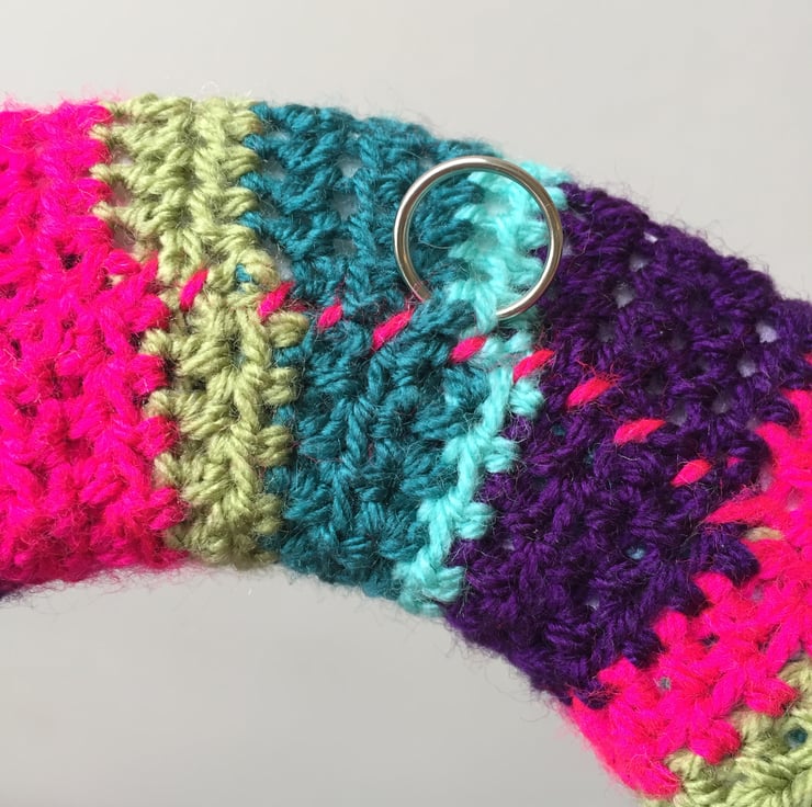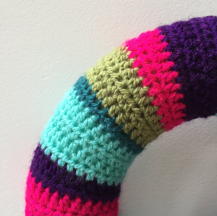 Crocheted in stripes of acrylic yarn in bright colours - bright pink, green, teal, turquoise and purple.