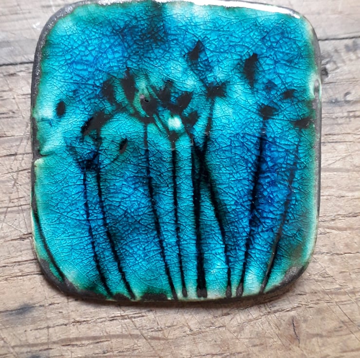 Decorated with seed head flowers .Glazed in a teal blue/green glaze.