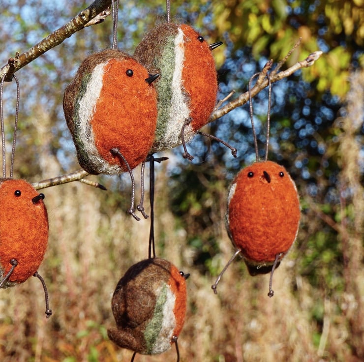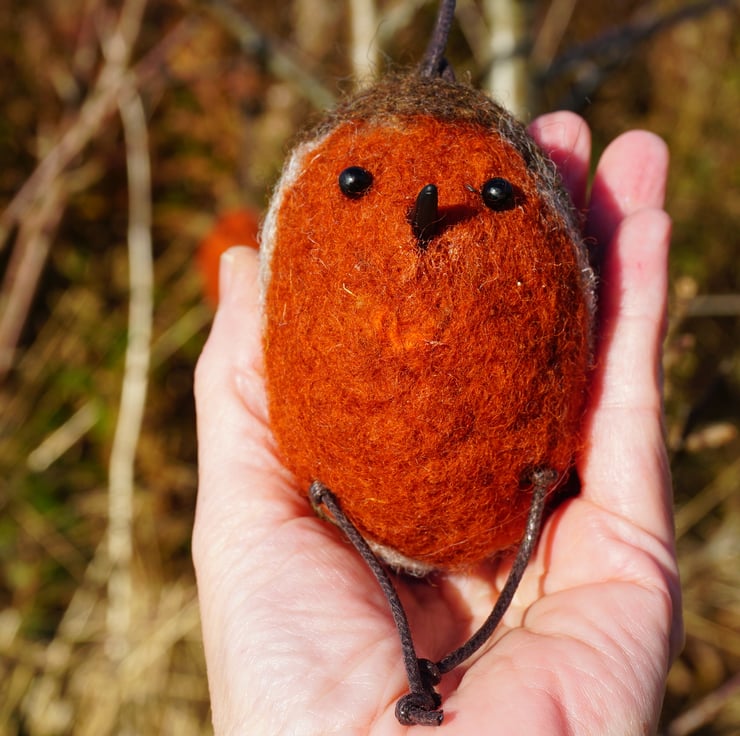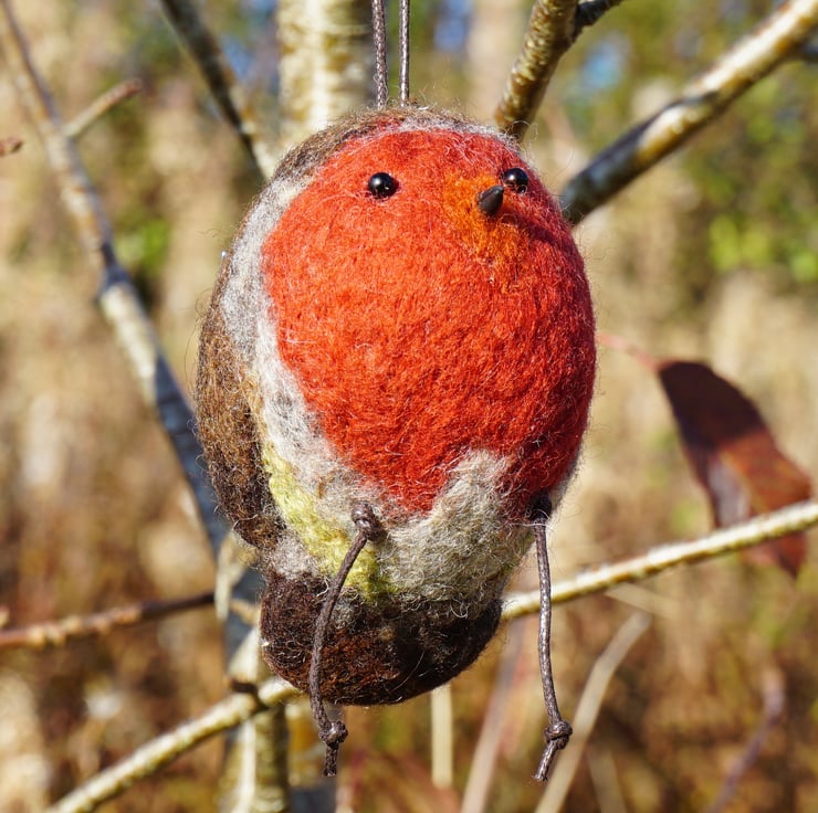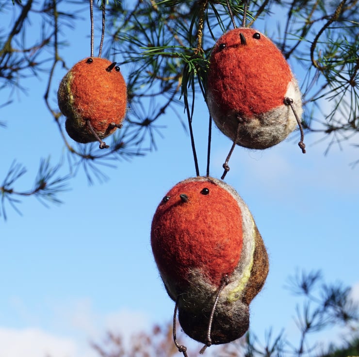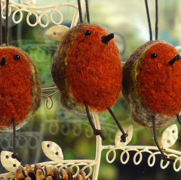 Unique hand felted robins made using the wet felting technique, these little birds look good all year round in your home,not just for Christmas, measure approx 4" tall.they have a hanging loop.