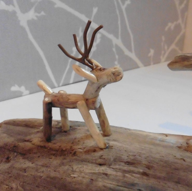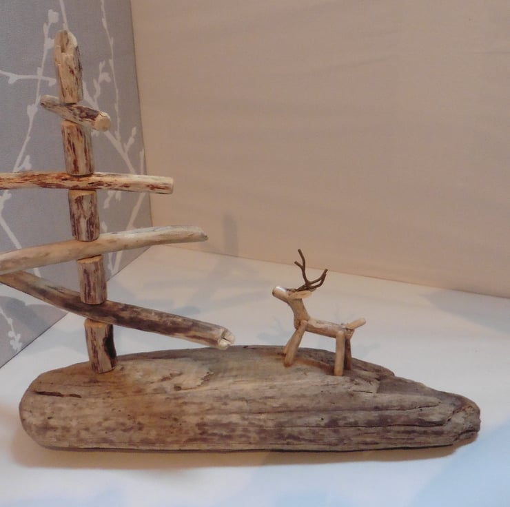 Reindeer and fir tree scene - a beautiful addition to your Christmas decorations or as an ornament all year round. Everything has been made from driftwood collected from the shores of south Wales apart from the antlers which are made from recycled copper wire (painted). All driftwood has been cleaned and sealed.