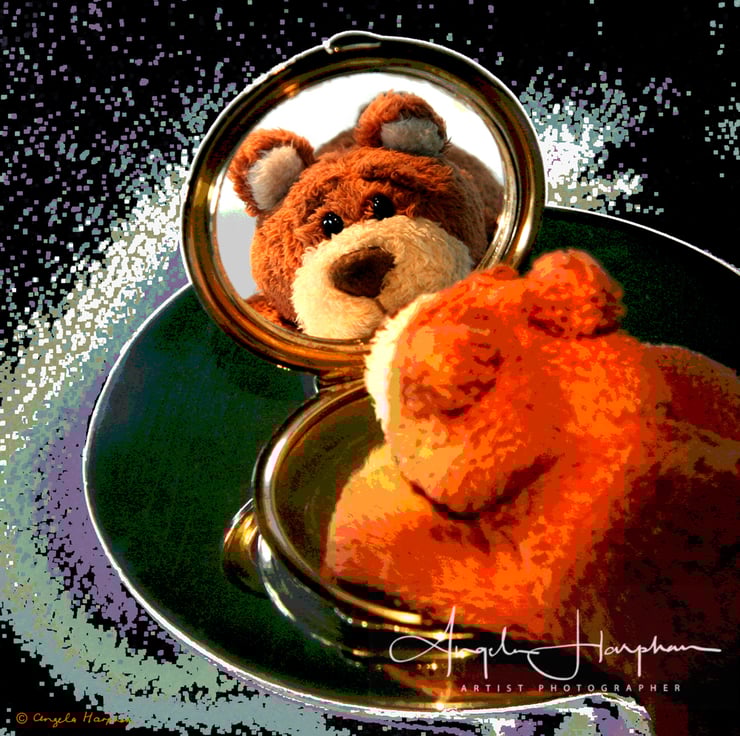 I took a number of still life photographs for a project and I love this one with my vintage compact and the cute wistful looking bear.
