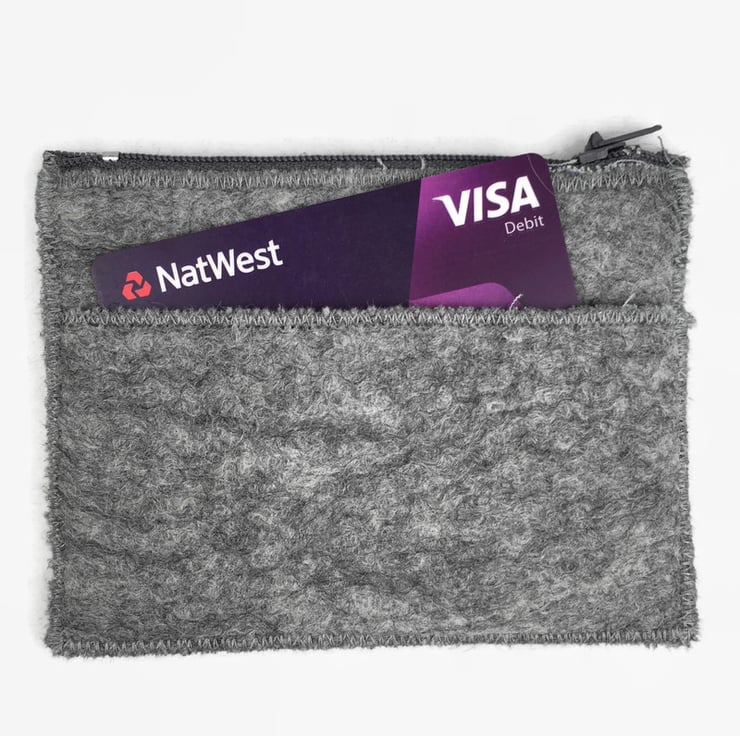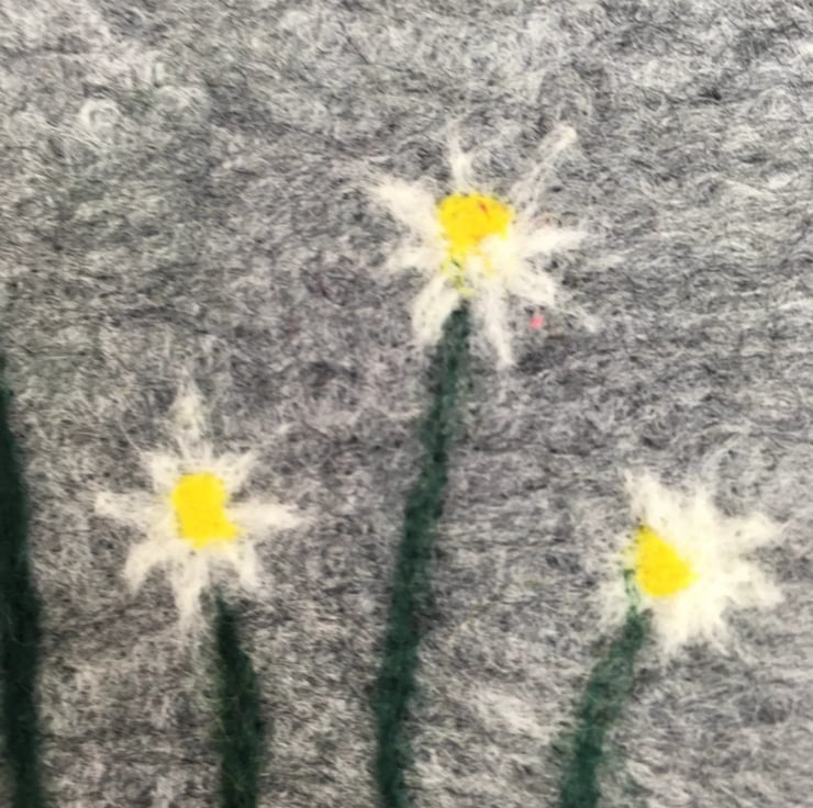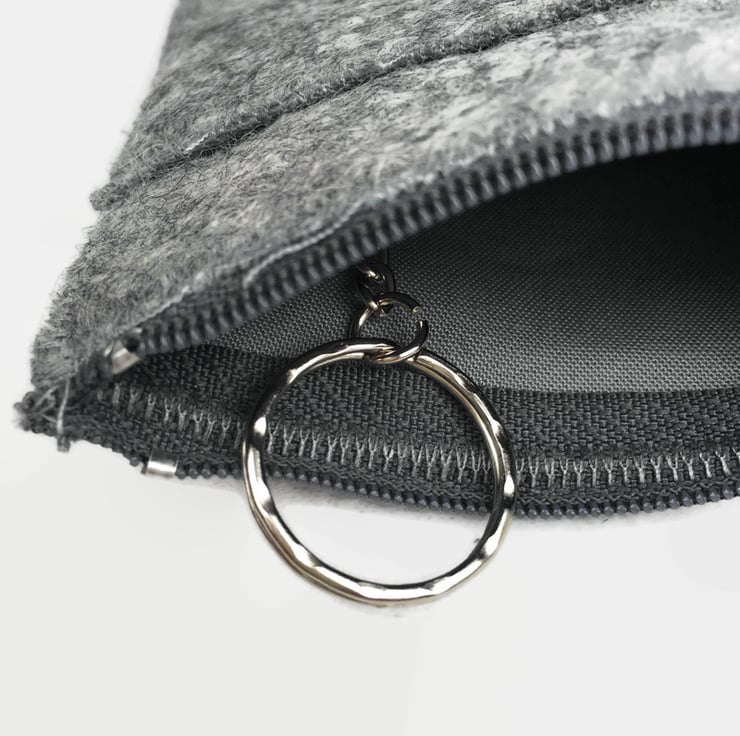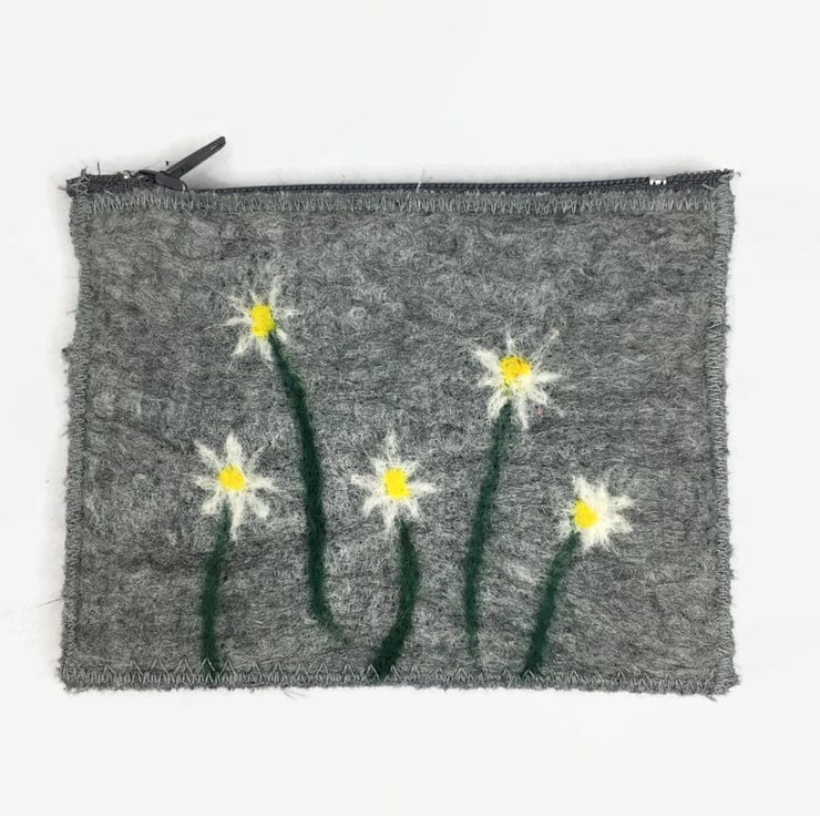 This grey felt purse has a pretty daisy design needle felted onto the front. The purse is made using a piece of hand felted grey felt. It has an external pocket on the reverse and an integral keyring attached to the inside by means of a short length of curb chain. The main compartment is closed by a zip fastening and is lined with a grey polycotton fabric.