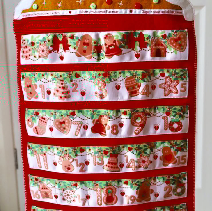 This felt advent calendar is 41cm wide and 64cm high (without the ribbon to hang the calendar). The advent calendar can be filled with any small items, each pocket is approximately 7cm wide and 6.5cm high.