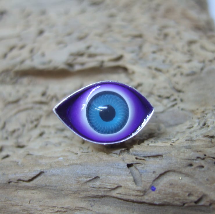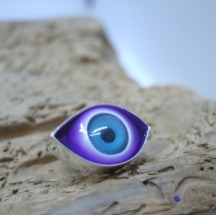 The Blue acrylic eye is set in Violet resin with the eyeball slightly protruding out from the setting.