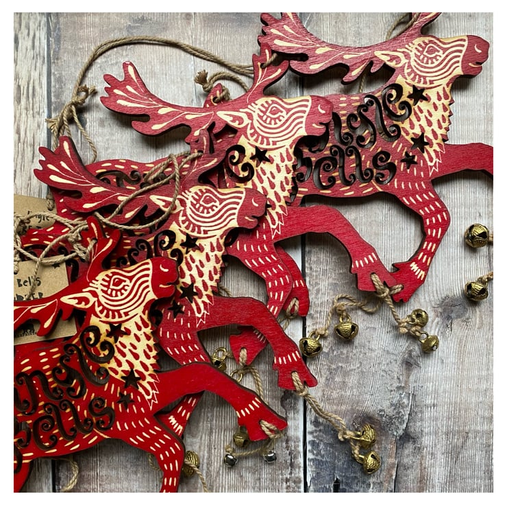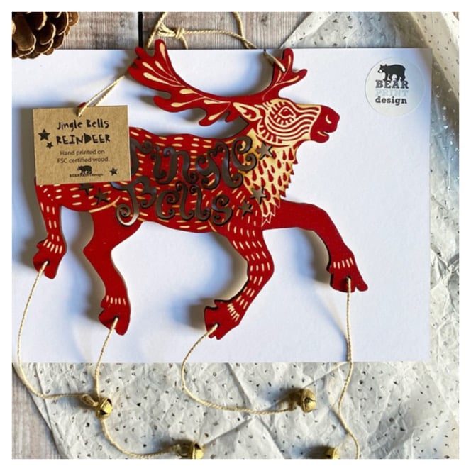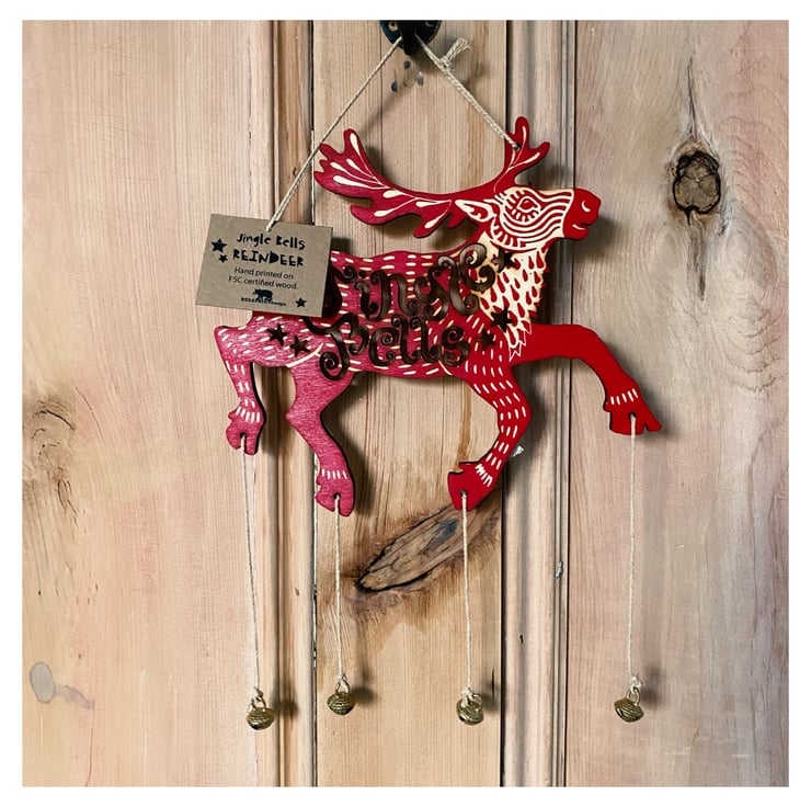 A delightful folksy hanging decoration just for the festive season! This hand printed reindeer is made to my own design in FSC certified birch wood and features cut-out words ‘Jingle Bells’. I printed it using an original linocut on a vintage Albion press using rubine red eco friendly ink. I then varnished it and strung it with four Indian claw bells. As it is hand printed, each reindeer will be slightly different and full of character. He measures approximately 20cm x 20cm and looks perfect hanging on a door or from a window to show off the seasonal message to one and all. Merry Christmas!