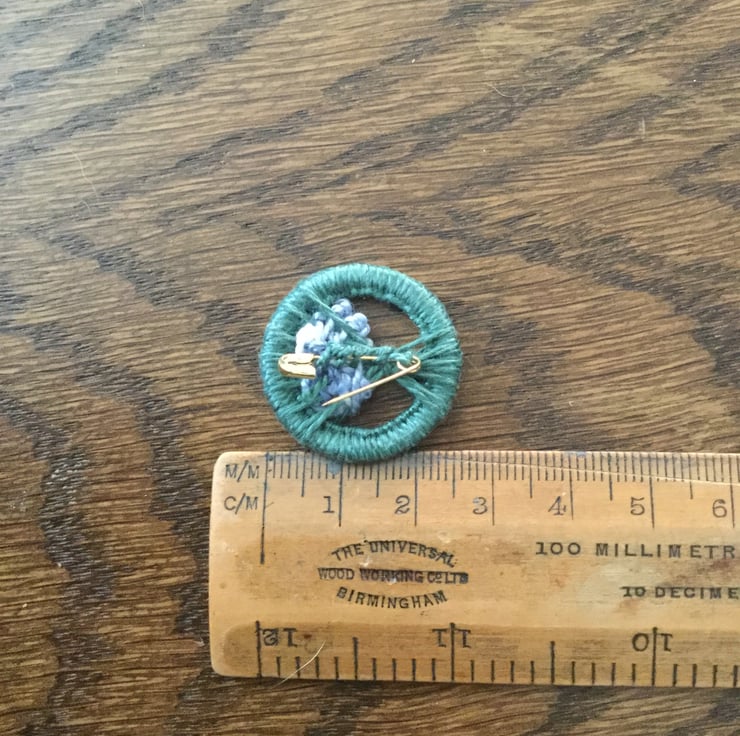 It features a brass ring covered with buttonhole stitches worked in a grey green cotton thread which has also been used to form the stalks of the posy. A spray of blossom is depicted with embroidered French knots in shades of blue.