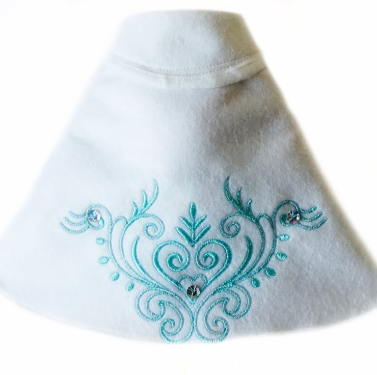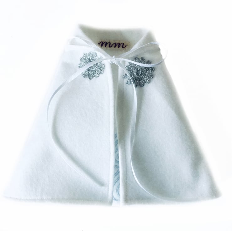 A lovely Regency style cape in snow white to fit the Mulberry Green characters. The cape is beautifully embroidered on the back with a Regency style scroll in pale turquoise. It is decorated with silver hologram sequins and is trimmed at the neck with two silver snowflakes. It is made from lovely soft felt and fastens with a white ribbon bow. A really beautiful cape that looks lovely with any of the Winter dresses.