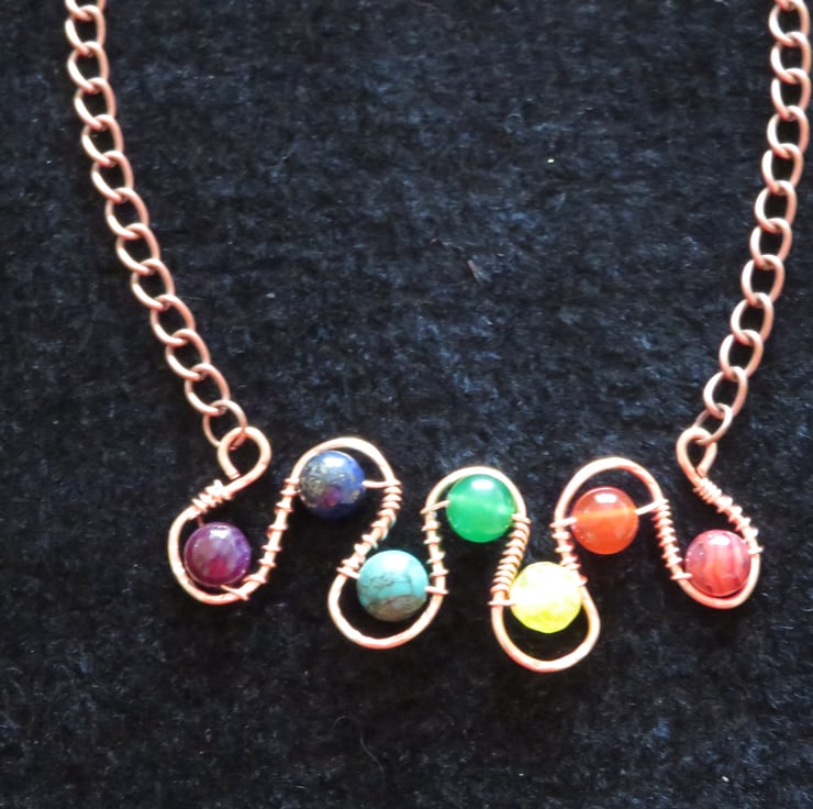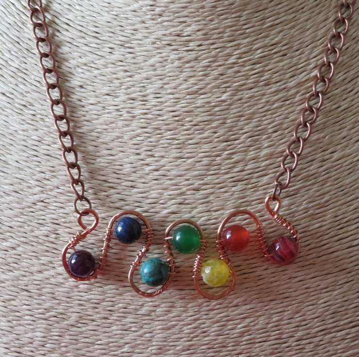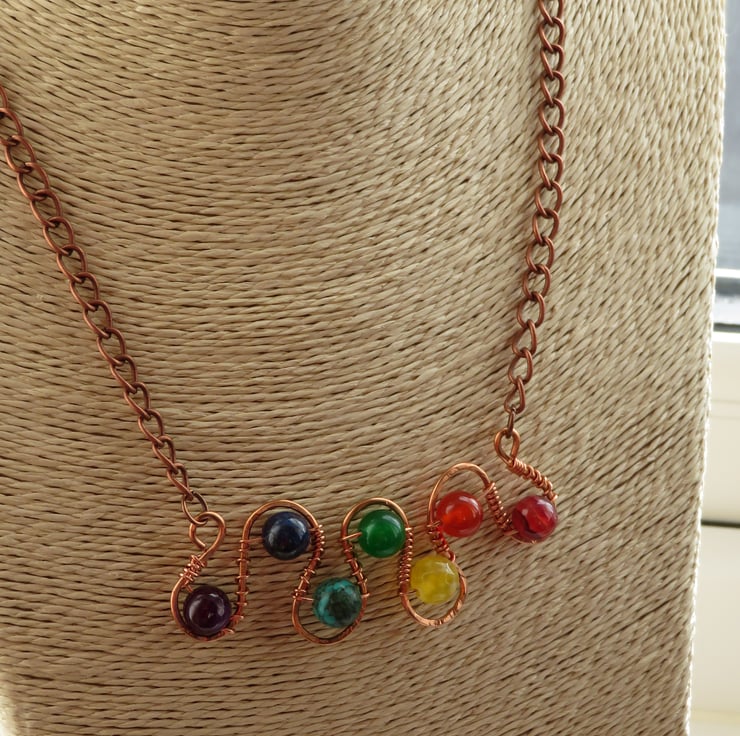 Here's a chakra necklace with a twist, several twists in fact! Sturdy copper wire has been formed into a series of curves, each containing a semi-precious stone representing the seven main chakras. The stones are held securely in place with 6mm copper wire and wire wrapped to hold them in place. The wire 'frame' has been hammered to give it a textured finish and a simple copper chain and lobster clasp complete this piece. The semi-precious stones I have used are:-