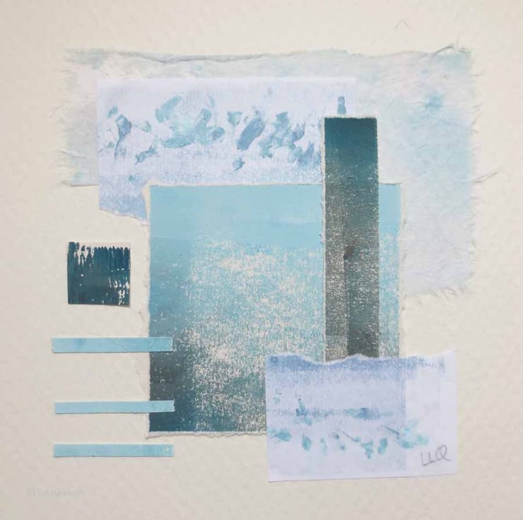 A mixed media collage abstract minimalist coastal view of the ocean from the beach in shades of teal and white.