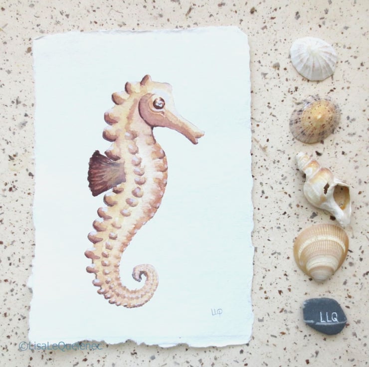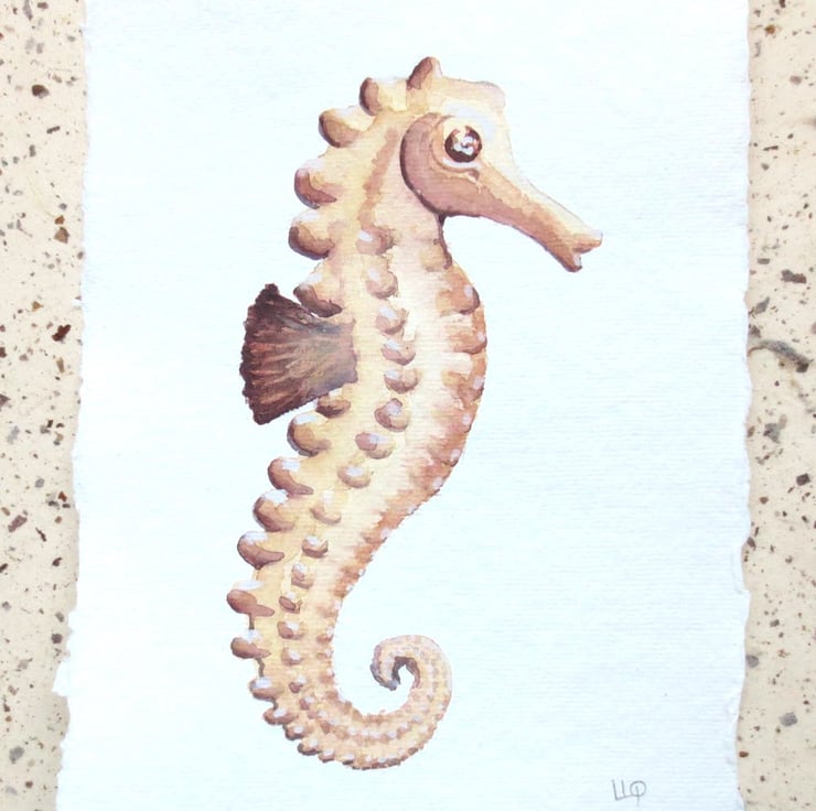 An original watercolour painting of a seahorse. Painted in artists quality watercolour on a beautiful piece of deckle edged textured paper. The size is approximately 15x21cm or 6x8inch (approx size due to the uneven deckle edge). The painting is signed in pencil in the lower right corner and is ready to ship.