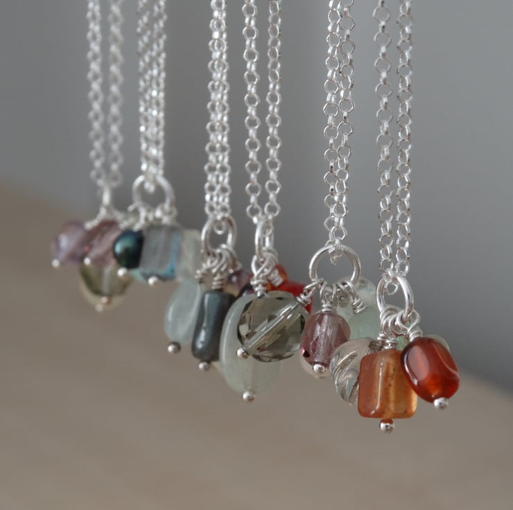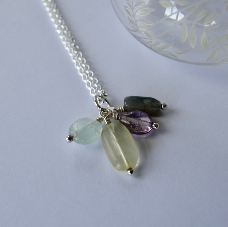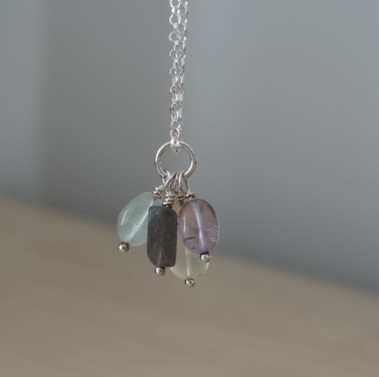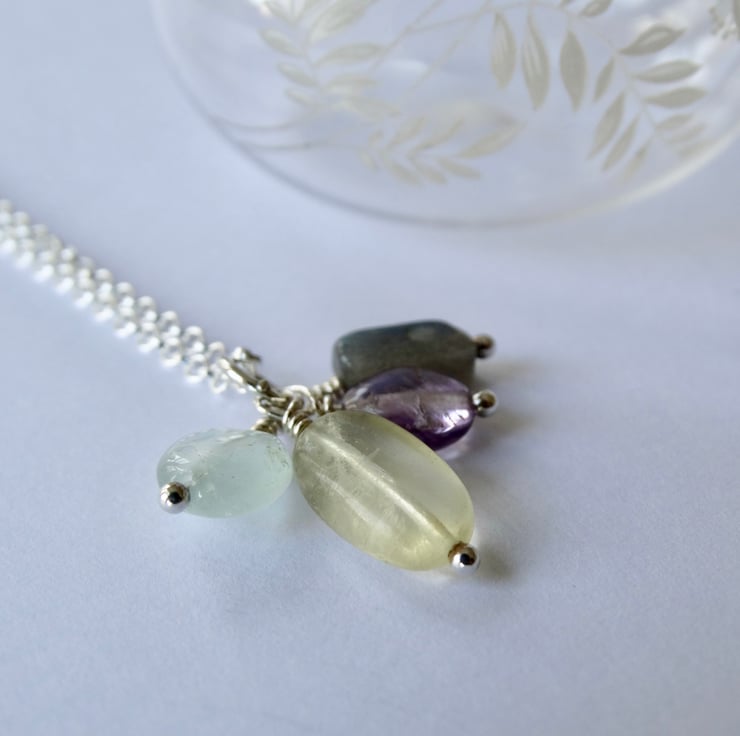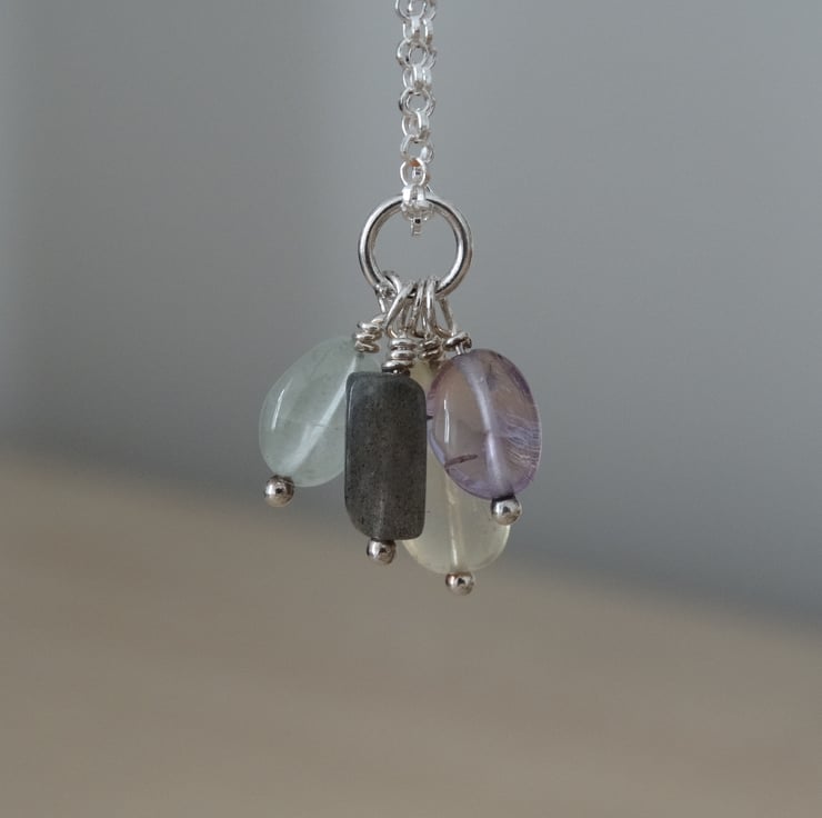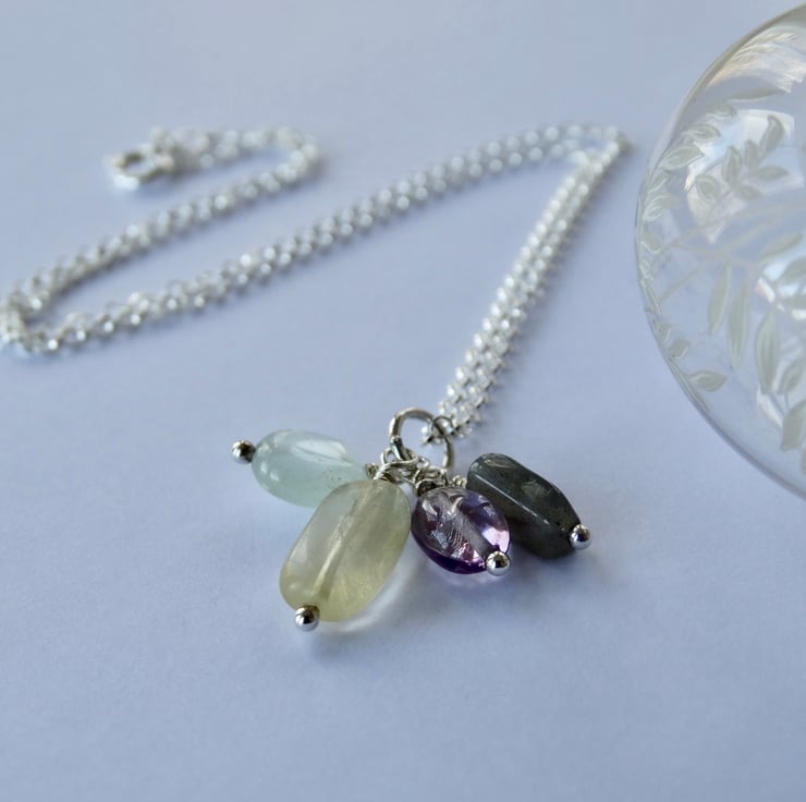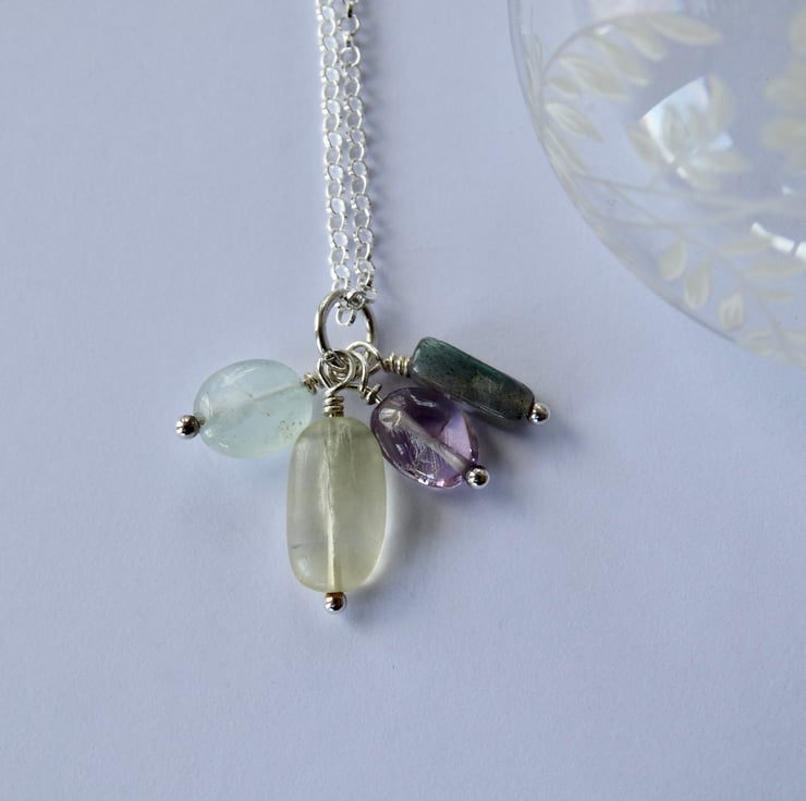 A cluster of semi-precious gemstone beads make up this pretty little charm pendant - a lozenge of yellow fluorite (11mm long), a little rectangular labradorite (8mm long), a pretty lilac coloured amethyst pebble (6mm long), and an aquamarine pebble (8mm long).