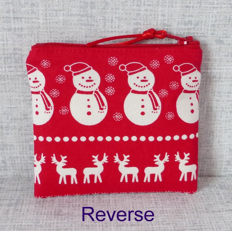 The main fabric has a dark red background with snowmen & reindeers in a cream colour...
