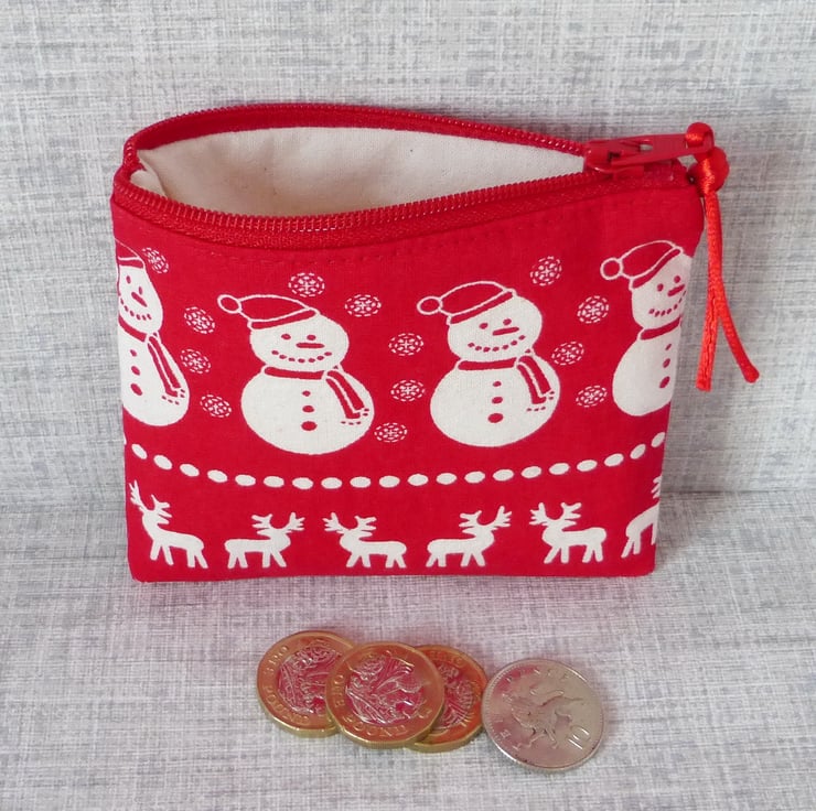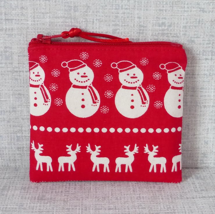 The main fabric has a dark red background with snowmen & reindeers in a cream colour...