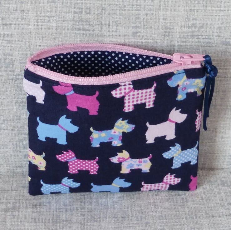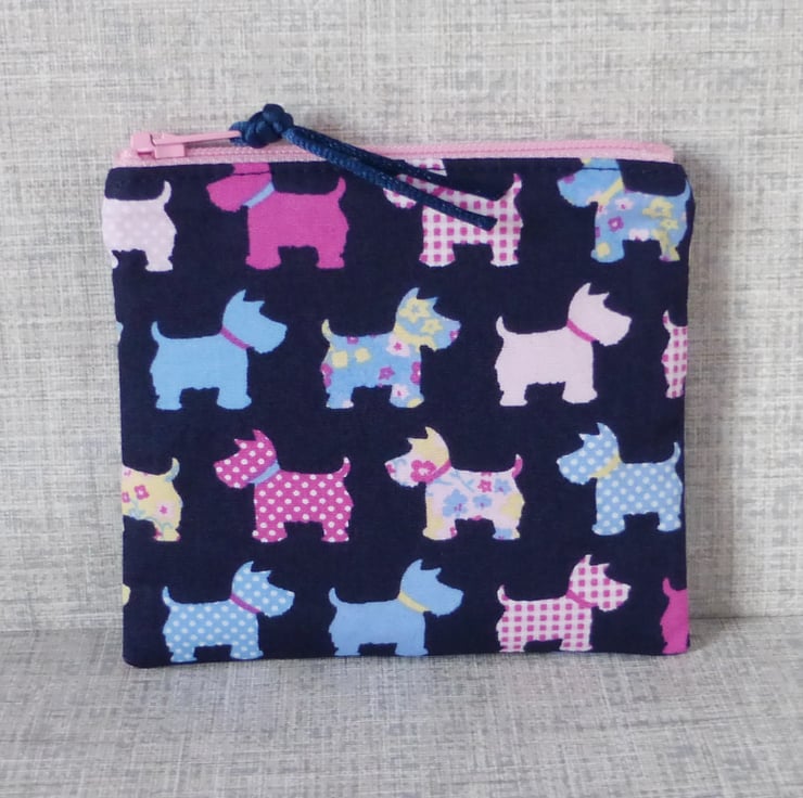 The main fabric has a dark blue background with scottie dogs in shades of blue and pink.