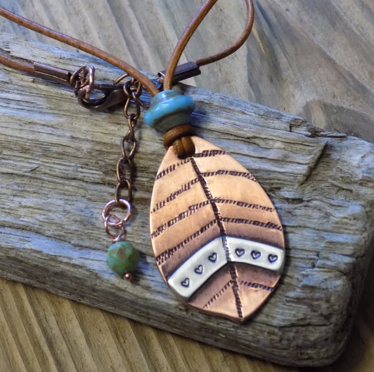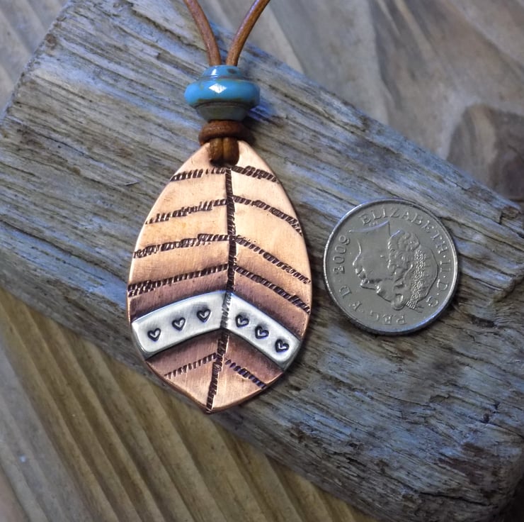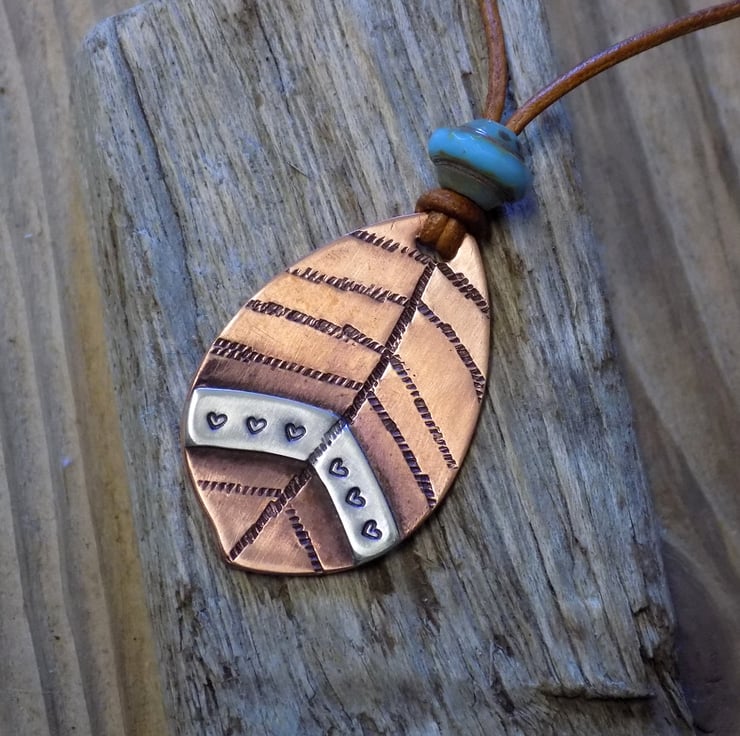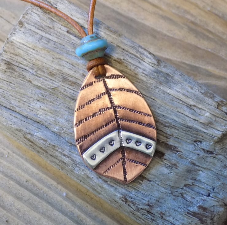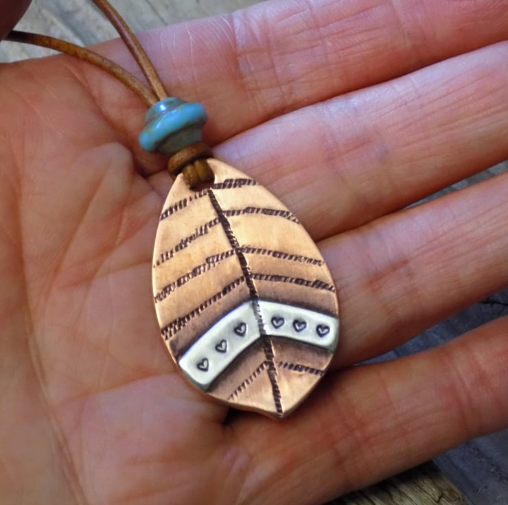 Made from thick 1.2 mm copper sheet, overlayed with sterling silver. The silver has been carefully soldered to the front of the leaf, and stamped with tiny hearts. The rest of the leaf has veins which have been individually formed with a metal punch. The whole pendant has an aged apperance which picks out all the detail and texture creating a lovely contrast between the silver and copper. Lastly a drilled out czech bead compliments the top of the pendant which has been simply strung onto vintage brown leather cord. Adjustable from 16-18 "